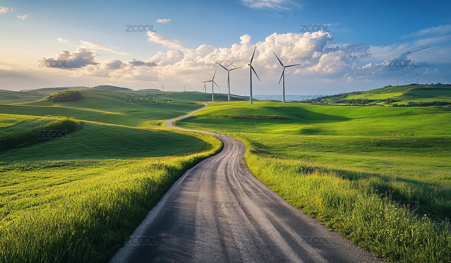 草原公路与风力发电机风景