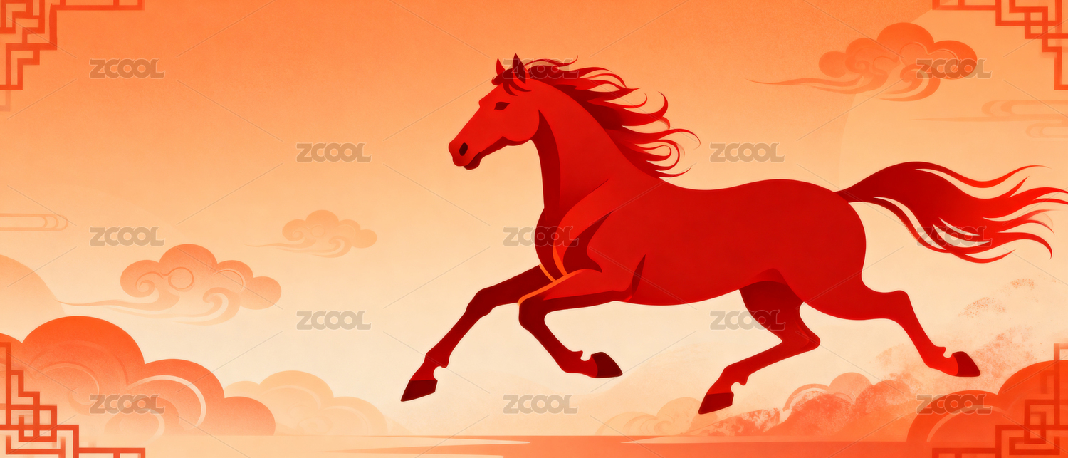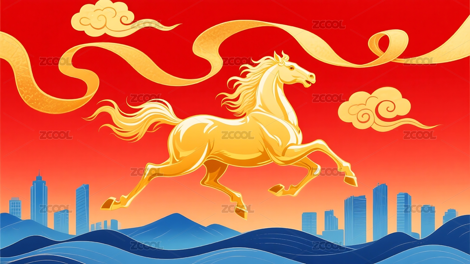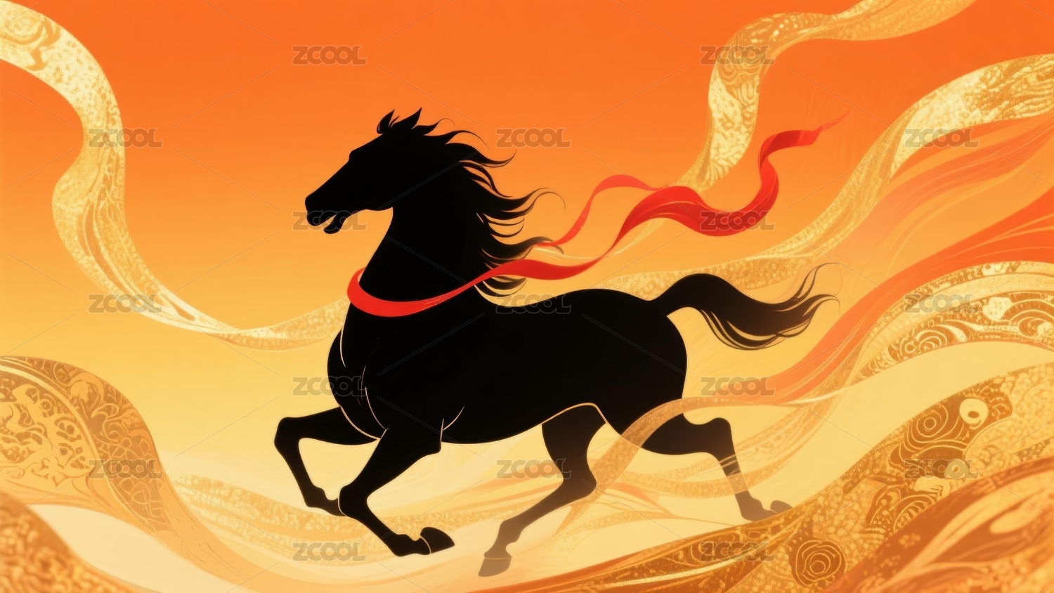 主视觉,商业,奔马,红绸,喜庆,场景,黑色,金色,传统,国风