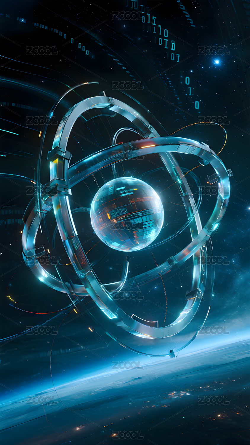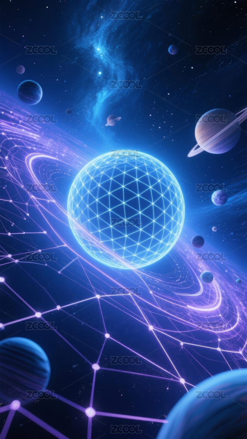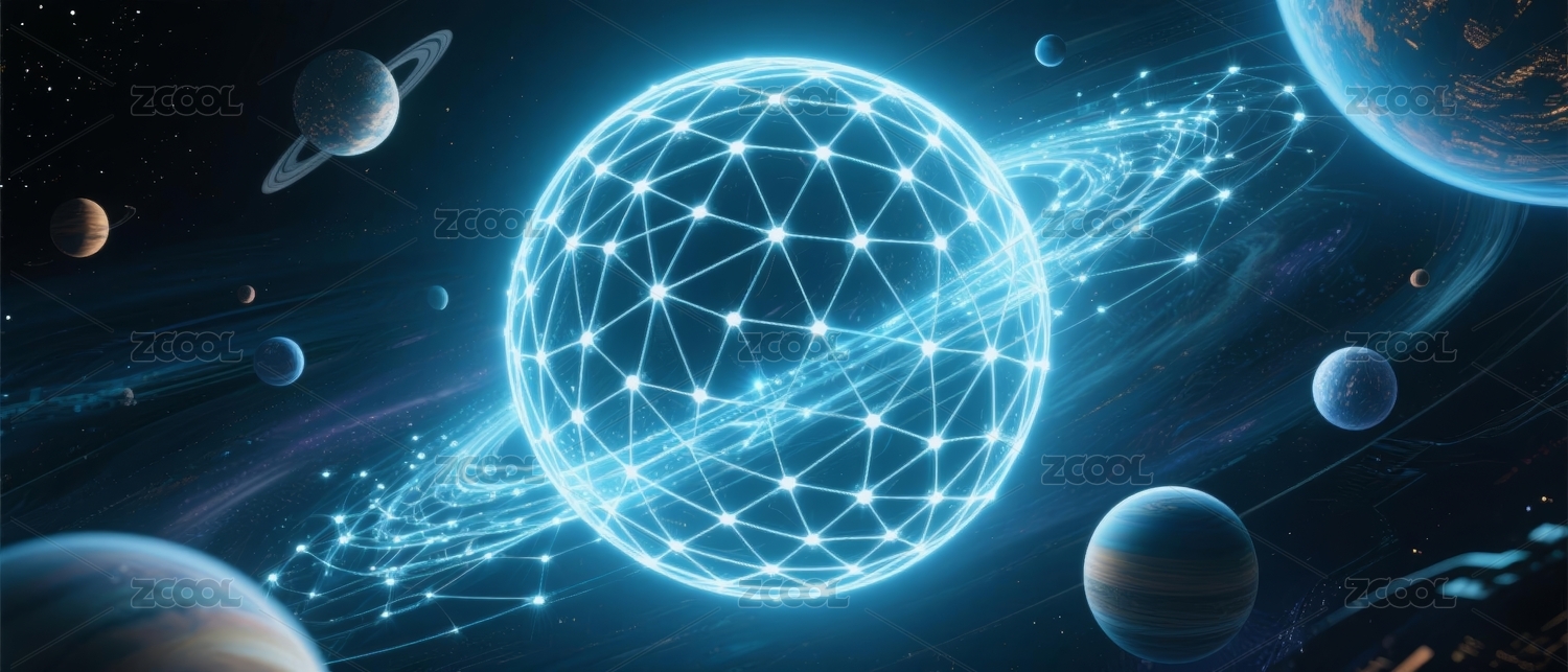 科幻未来宇宙星空中的蓝色戴森球插画绘画