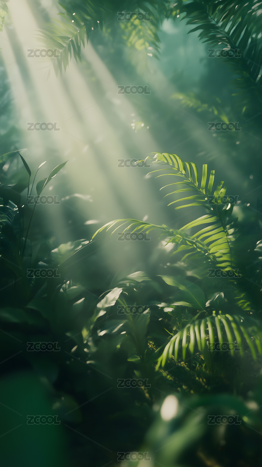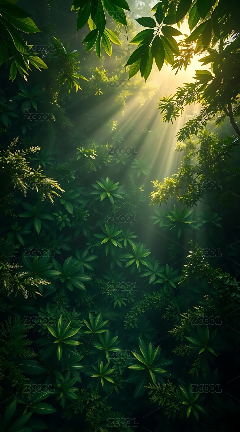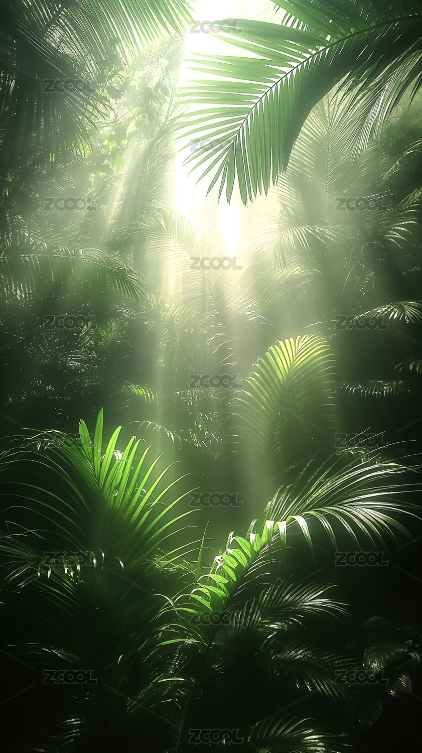 郁郁葱葱的热带雨林阳光穿过树叶照射进来