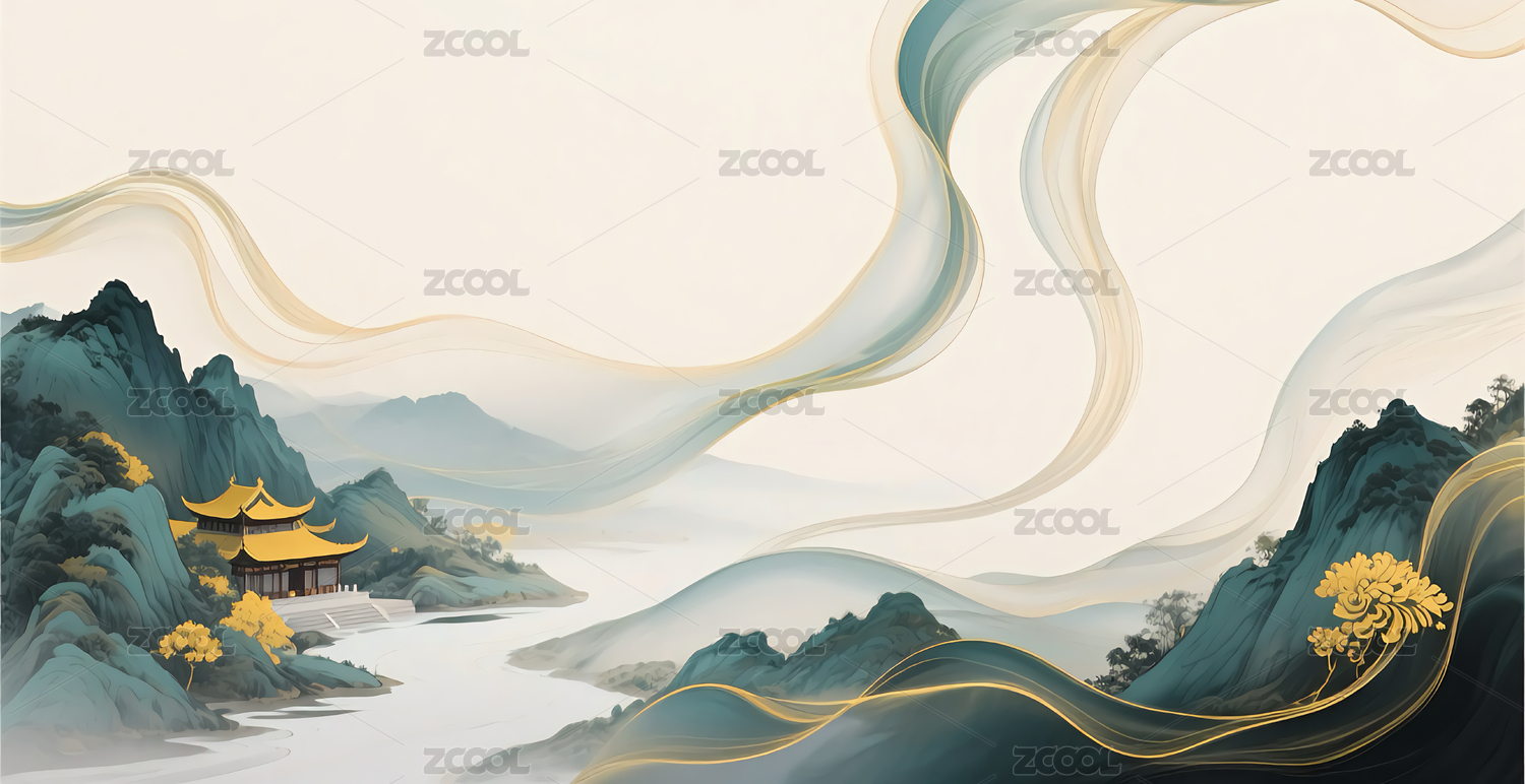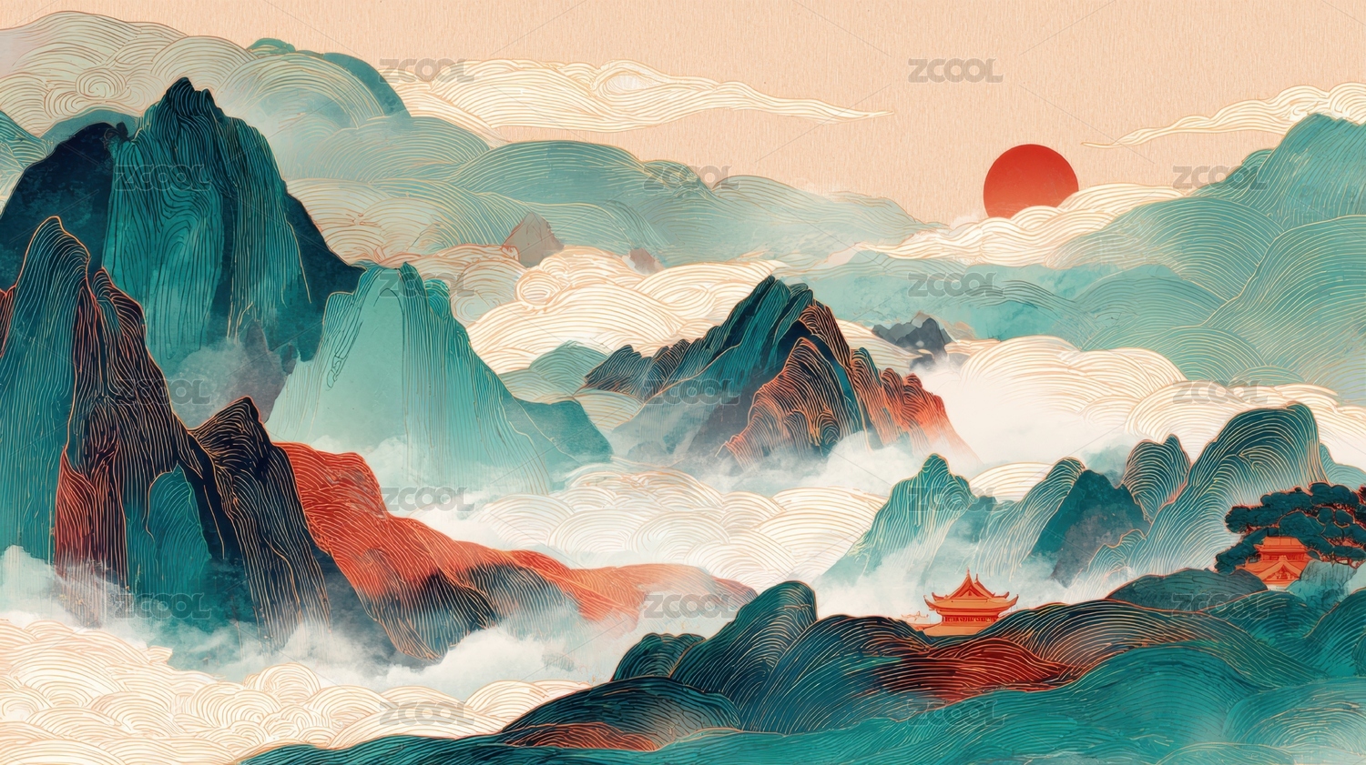 青绿,山水,楼阁,国风,意境,古典,艺术,绘画,风景,建筑