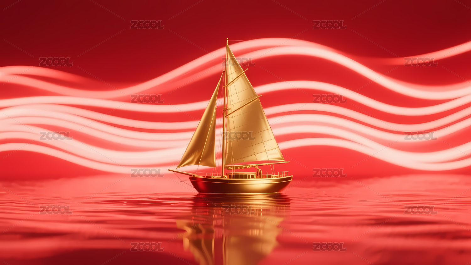 金色帆船红色波浪背景