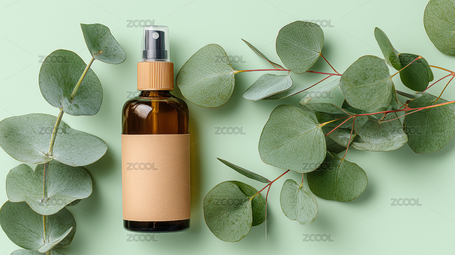 美妆,平铺,喷雾瓶,琥珀,玻璃,标签,牛皮纸,桉树叶,背景,绿色