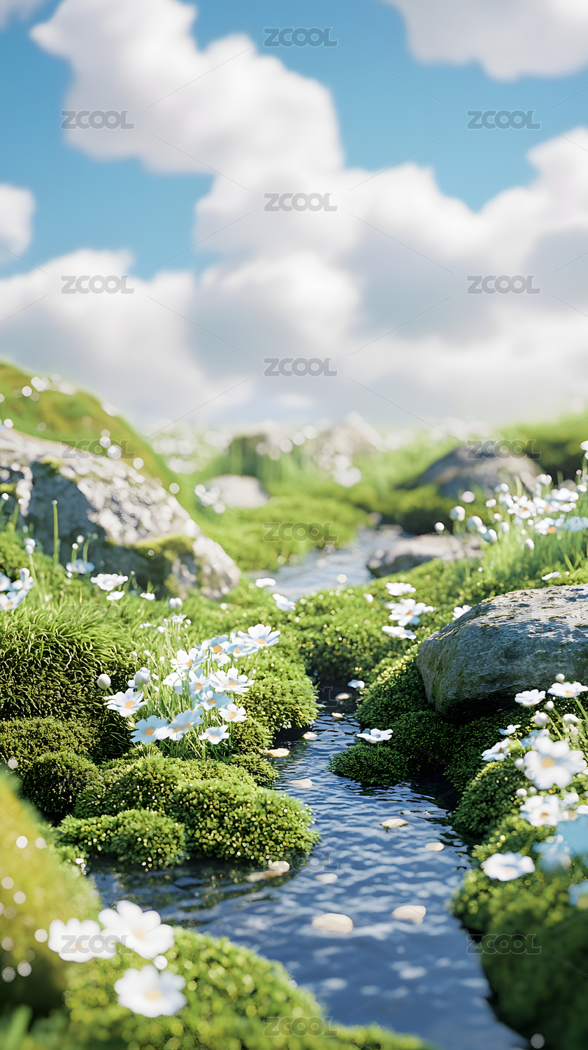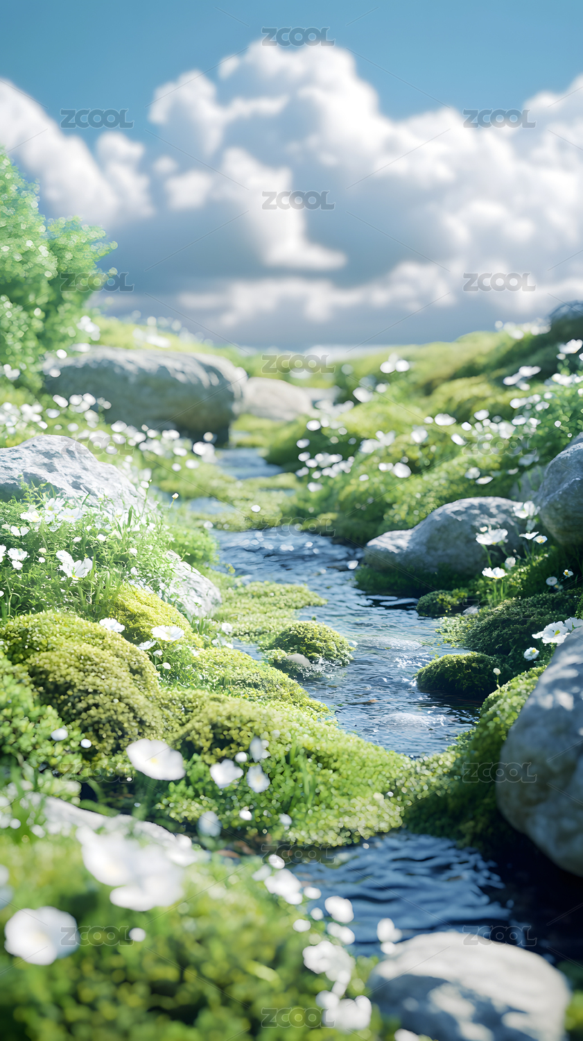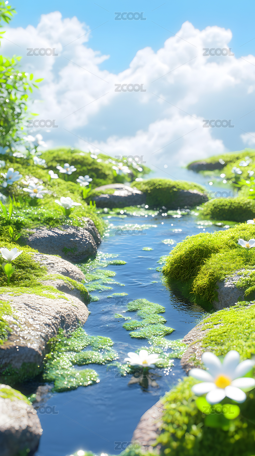 溪流,绿苔,石头,清澈,自然,蓝天,树木,水体,宁静,生态