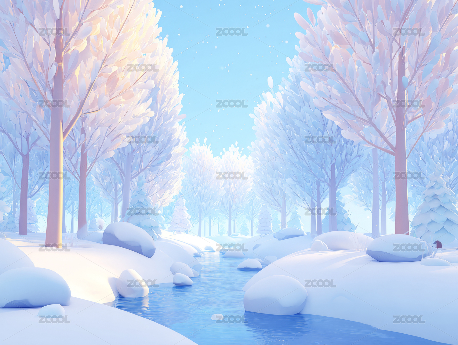 梦幻雪林小溪景
