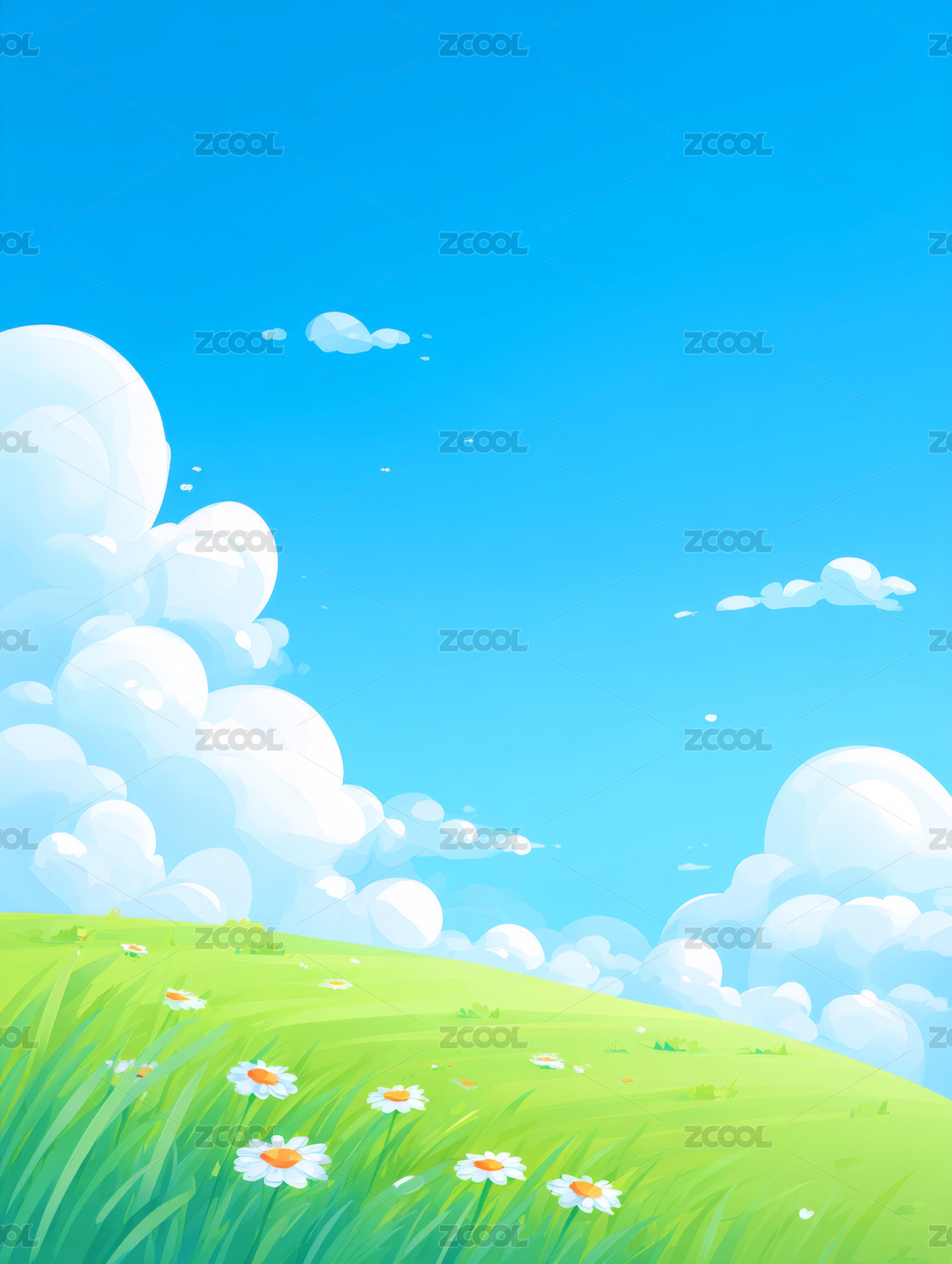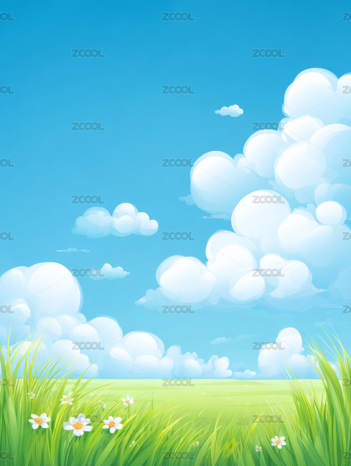 蓝天,白云,绿草,花朵,清新,自然,卡通,风景