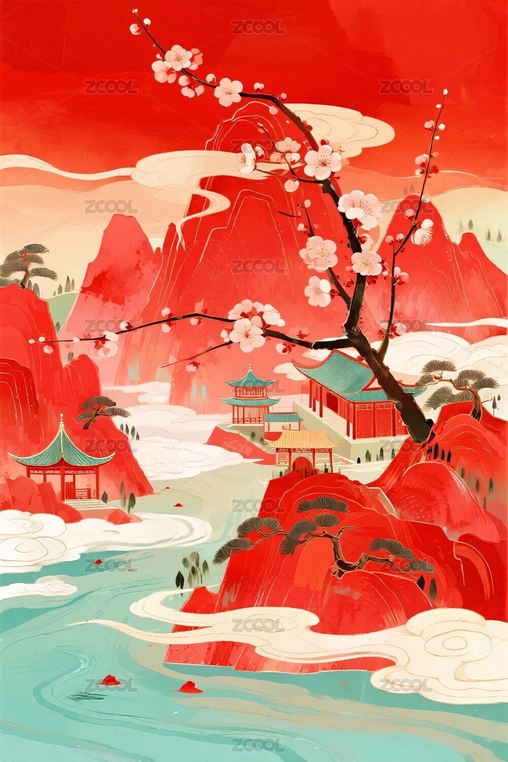 古塔,山,水,树,鸟,远山,河流,风景,建筑,红色