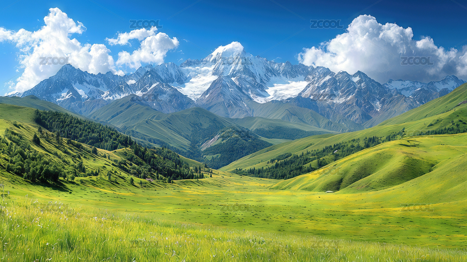 高山,草原,蓝天,白云,雪山,野花,绿草,风景,自然,美丽