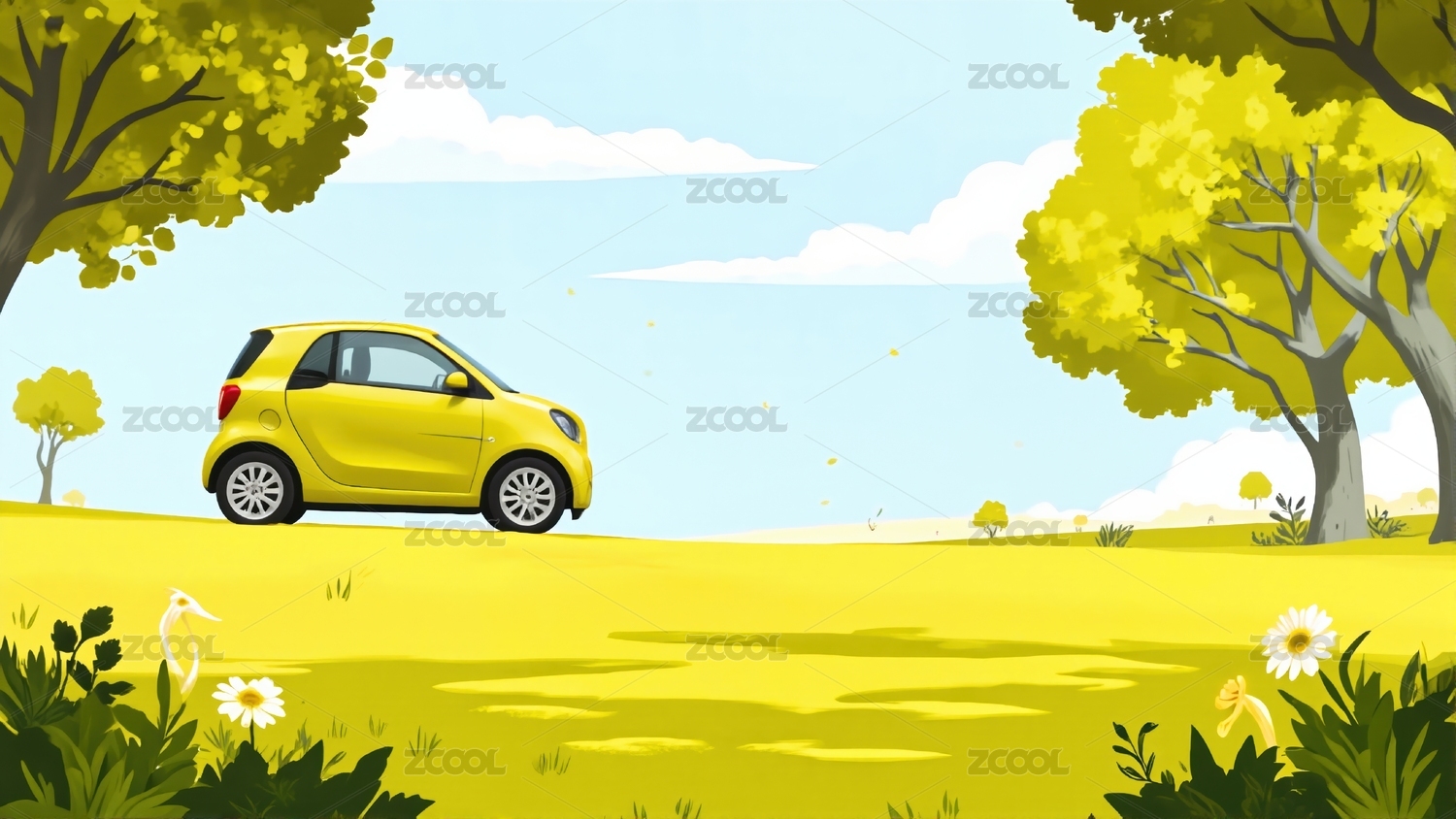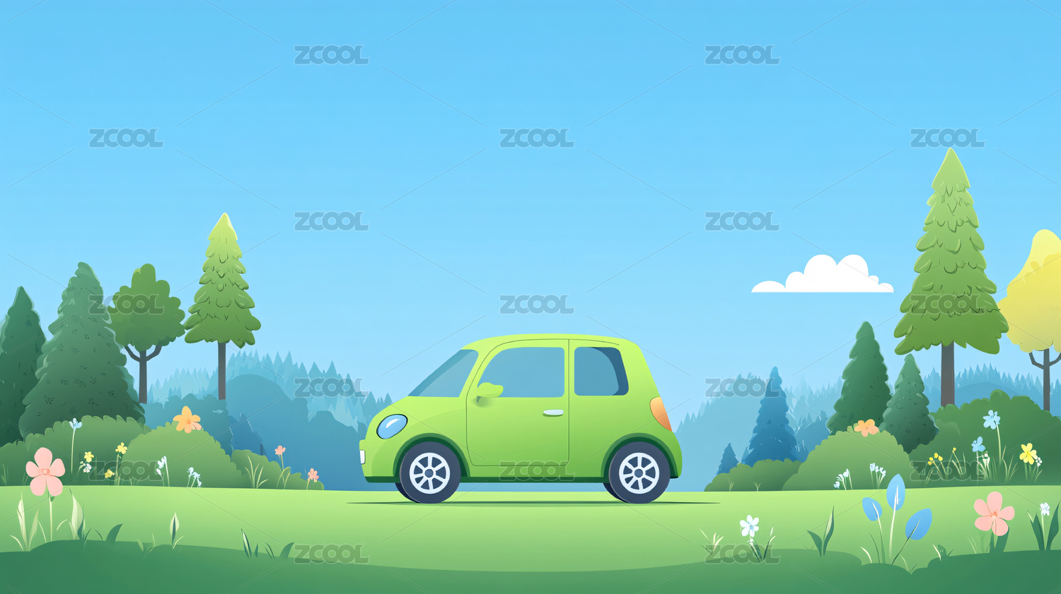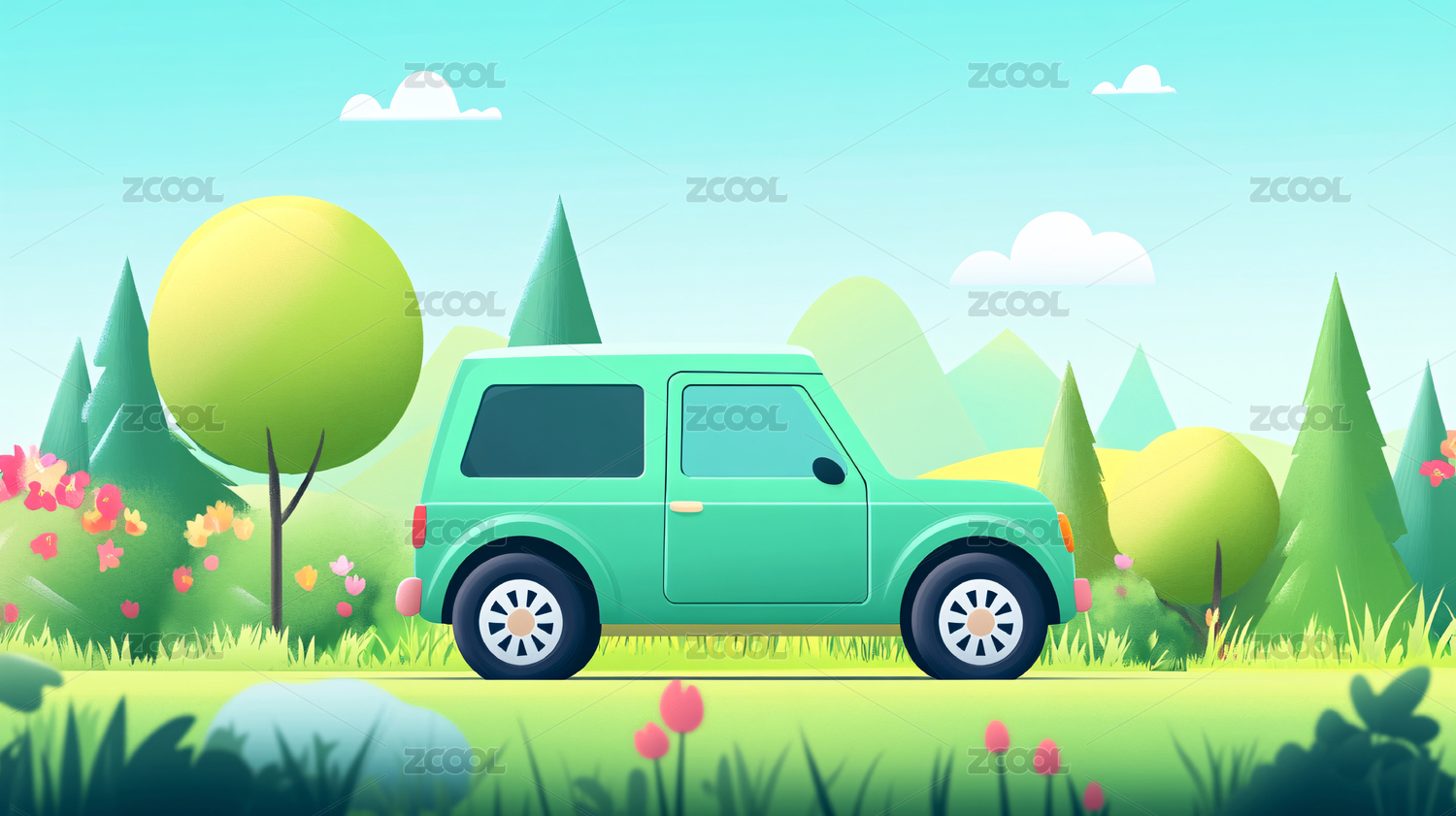 绿色,小车,自然,风景,树木,草地,花朵,蓝天,白云,阳光