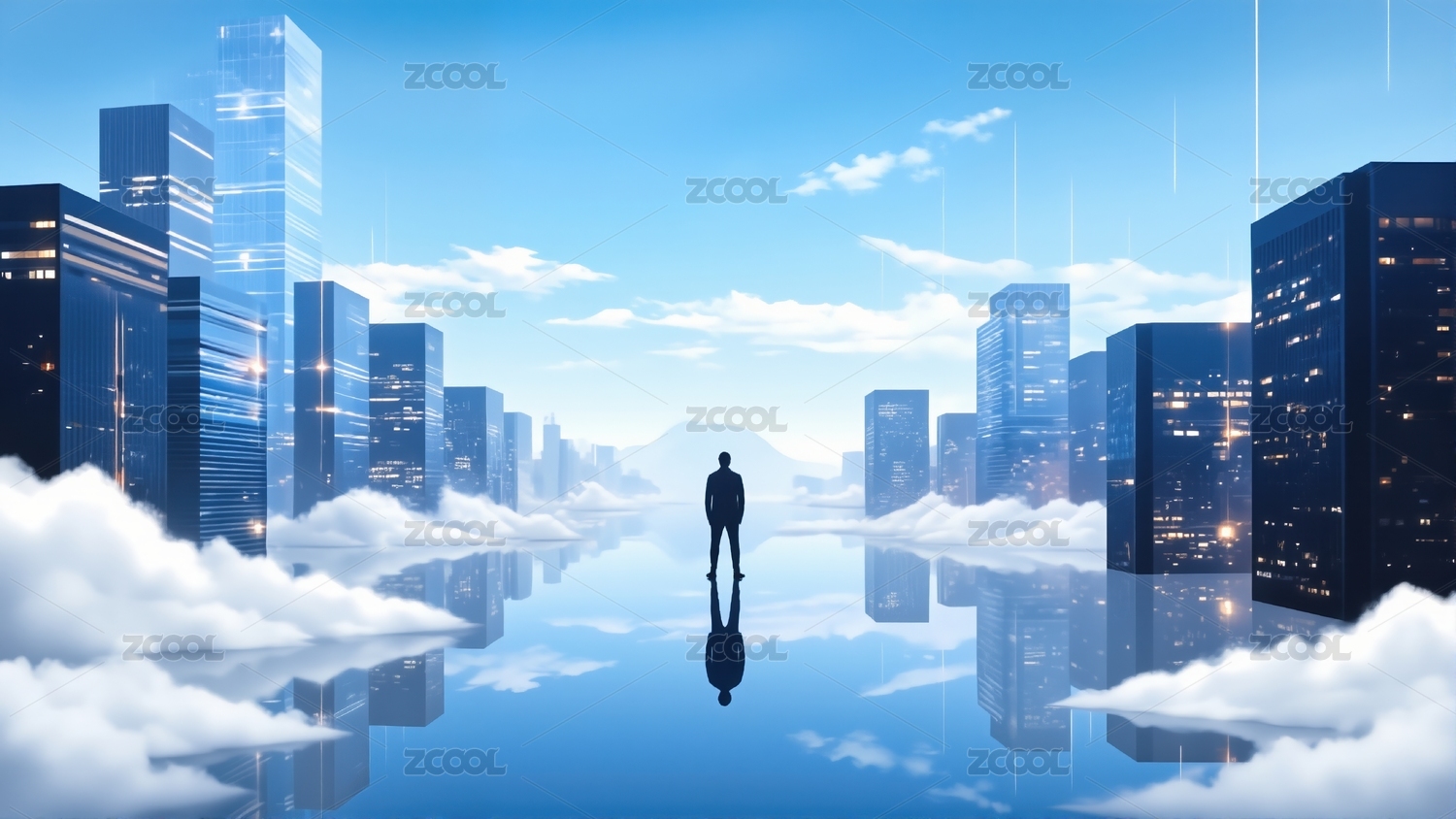 城市,高楼,天空,云朵,倒影,街道,蓝色,未来,建筑,人物