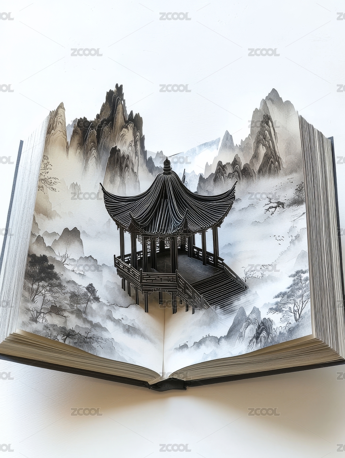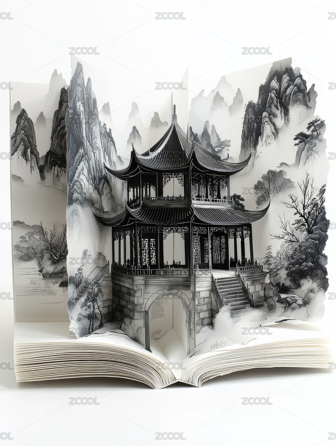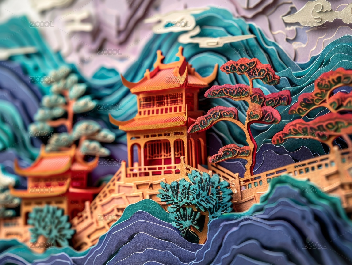 书,山水画,古建筑,瀑布,桥梁,树木,假山,模型,立体,艺术