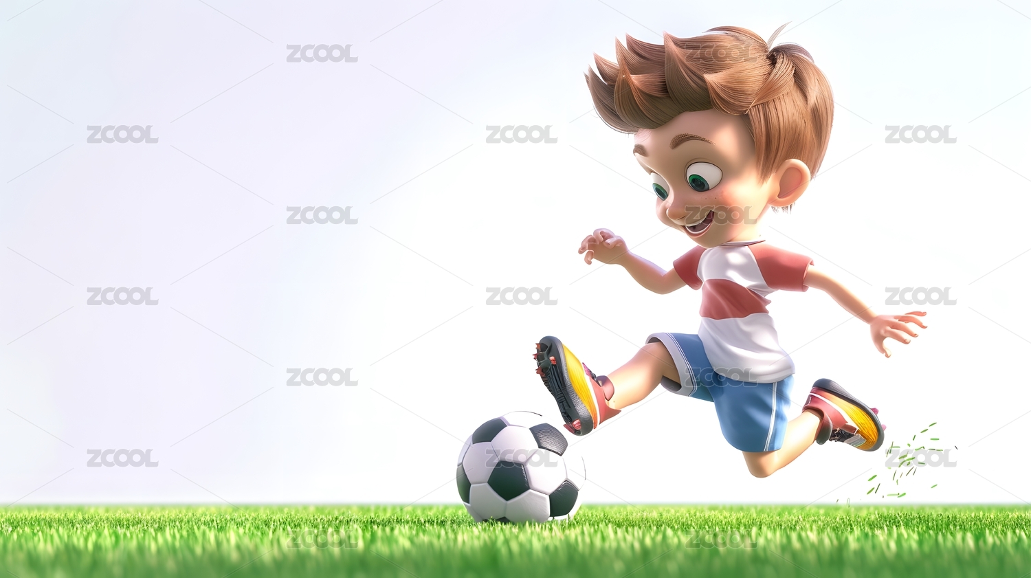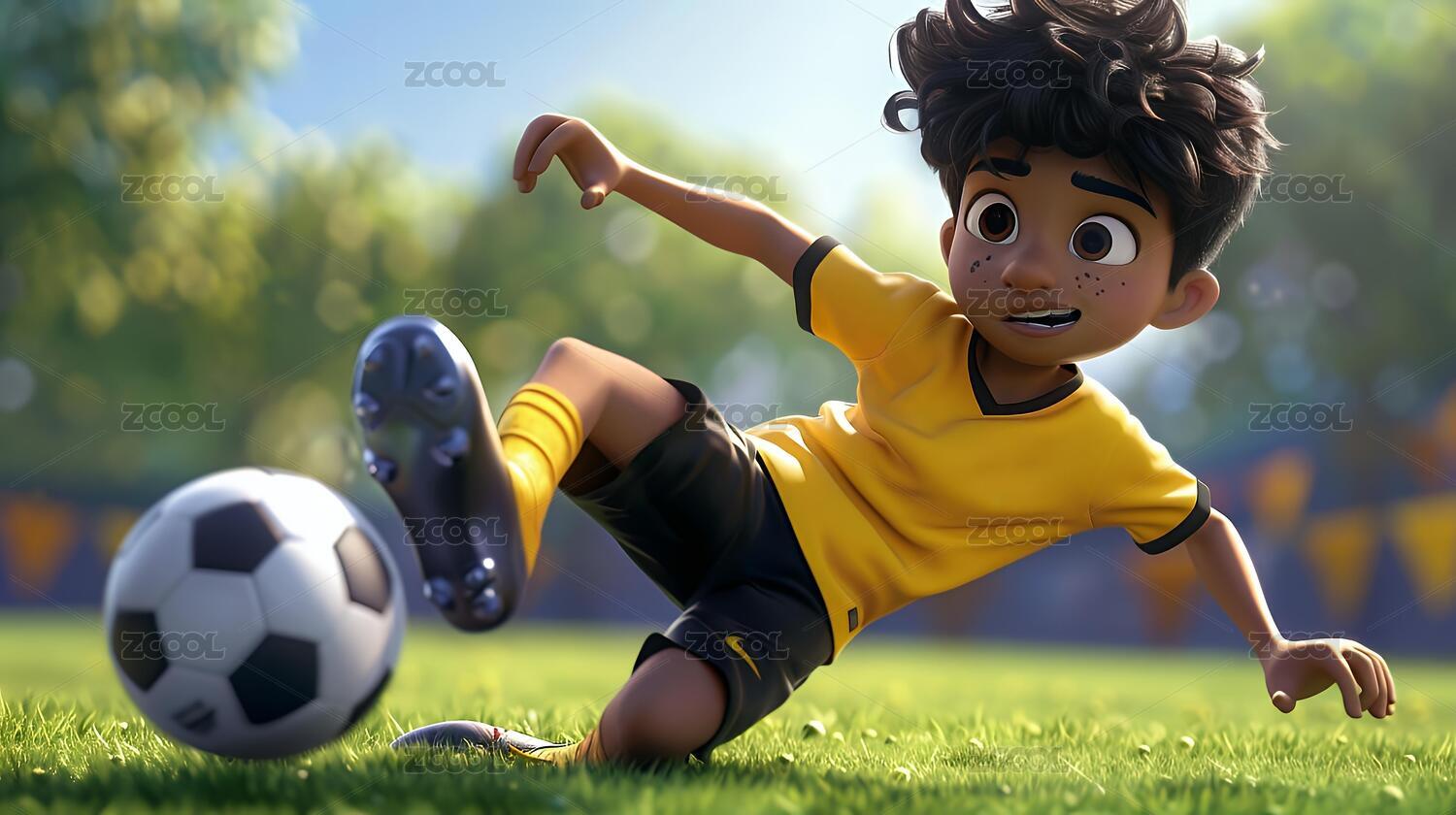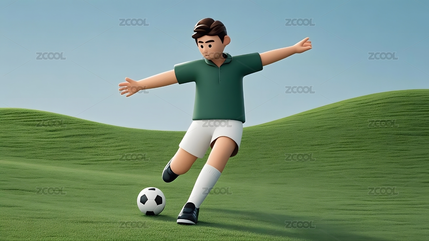 3D卡通风格,一个可爱的男生在草坪上踢足