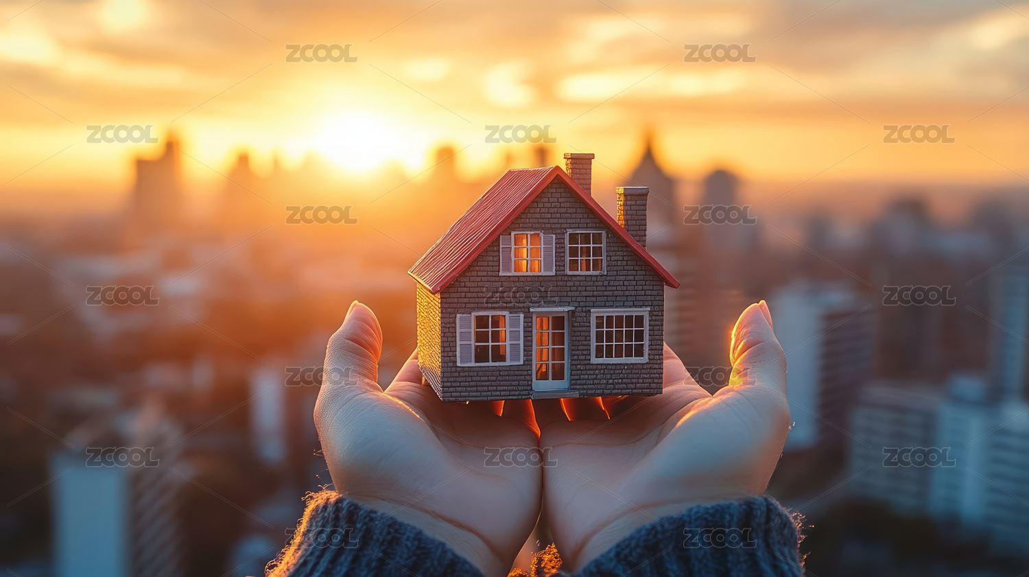 楼房背景下手托着一个小房子玩具——房地产概念图片