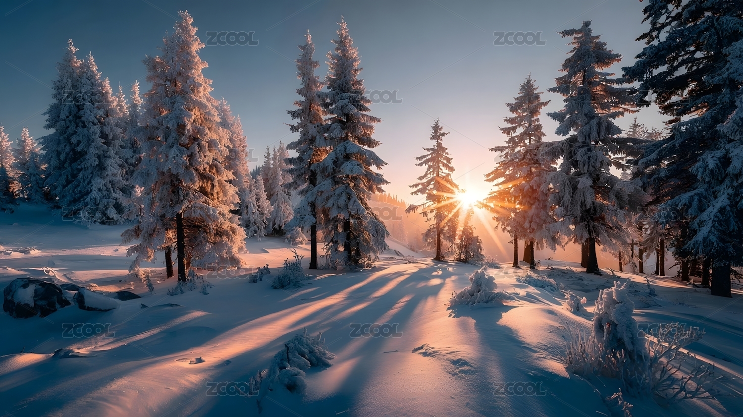 雪地松林日出