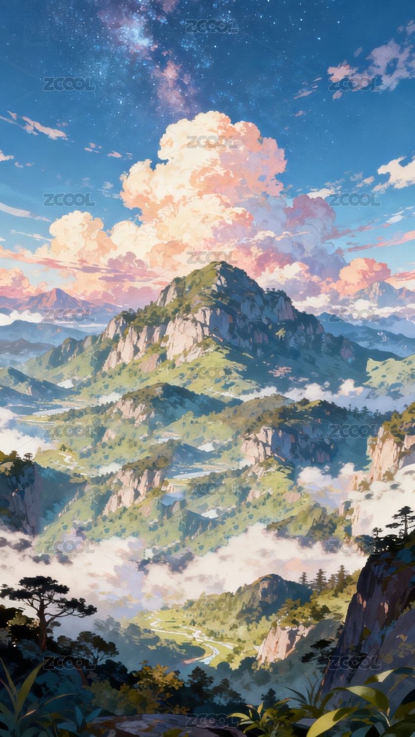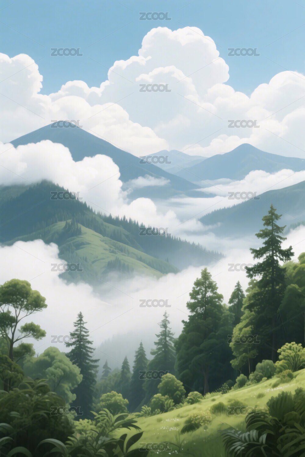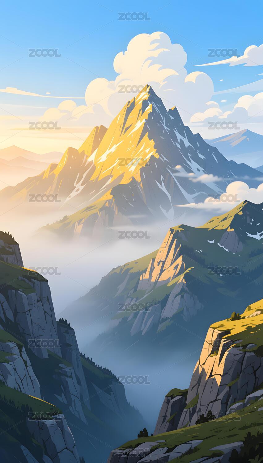 山峰,太阳,云海,植物,插画,风景,自然,日出,天空,云朵