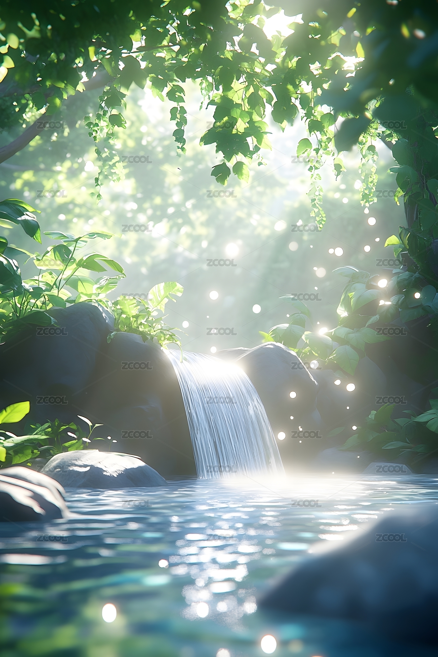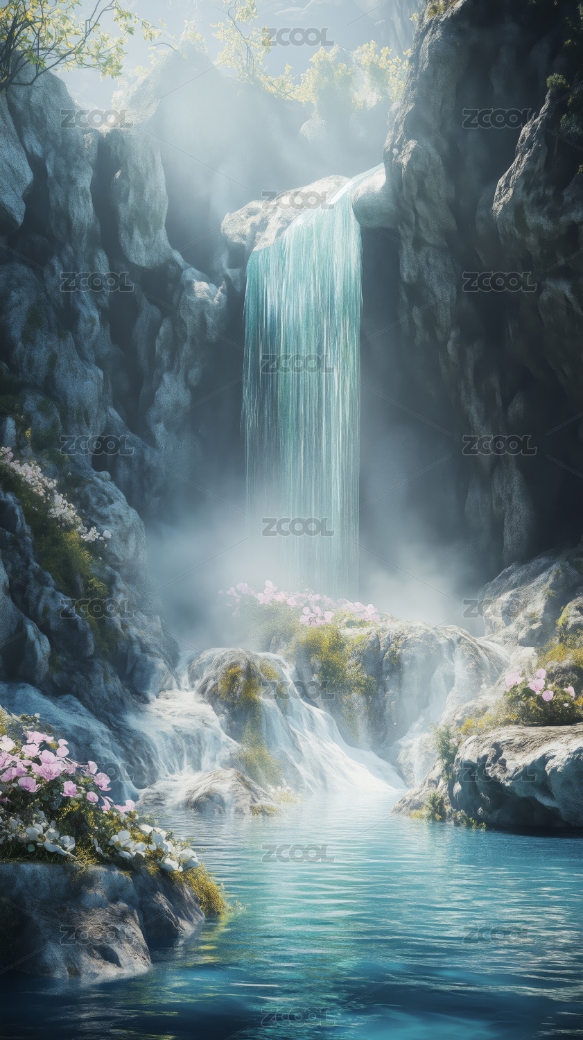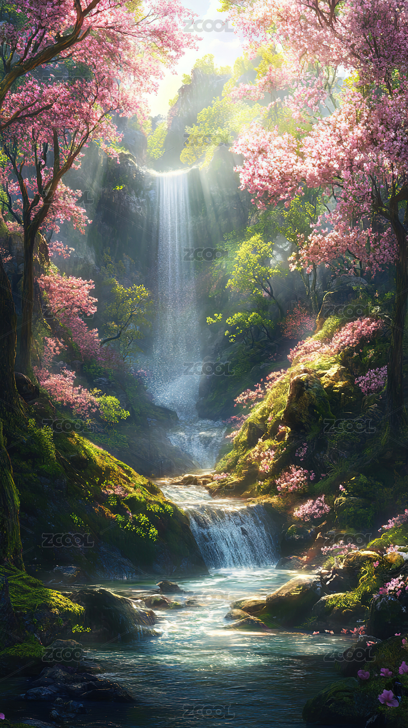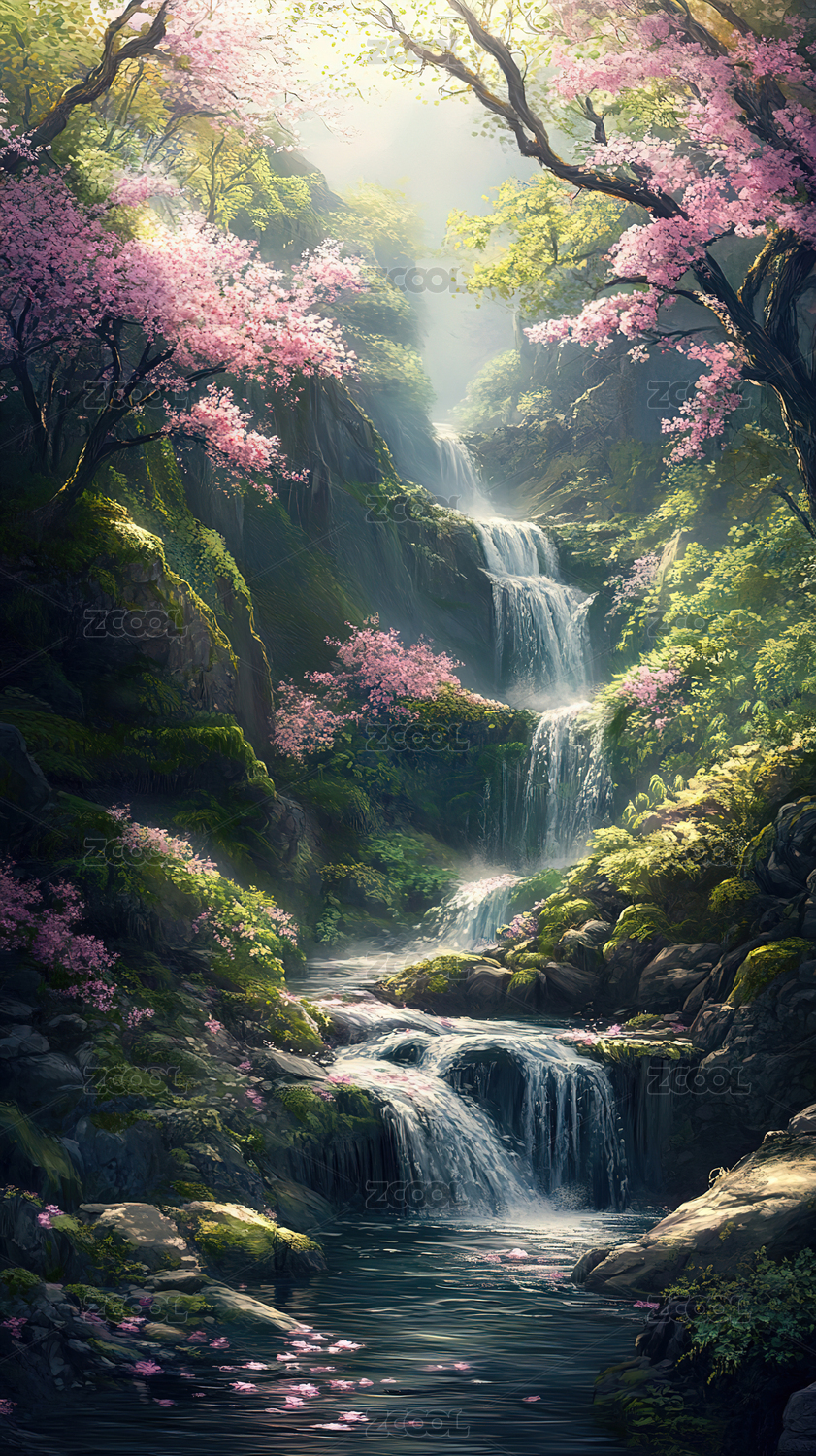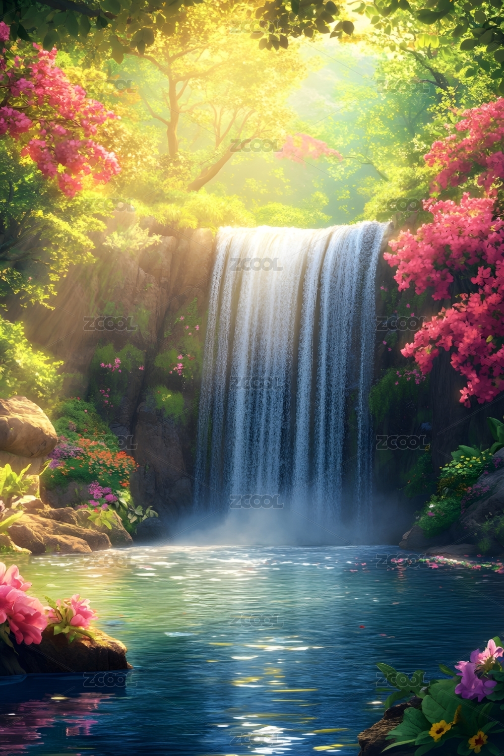 瀑布,花朵,森林,溪流,绿色,自然,清新,光影,苔藓