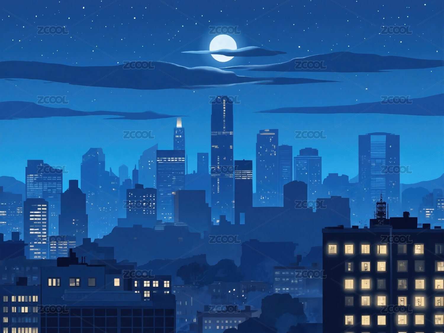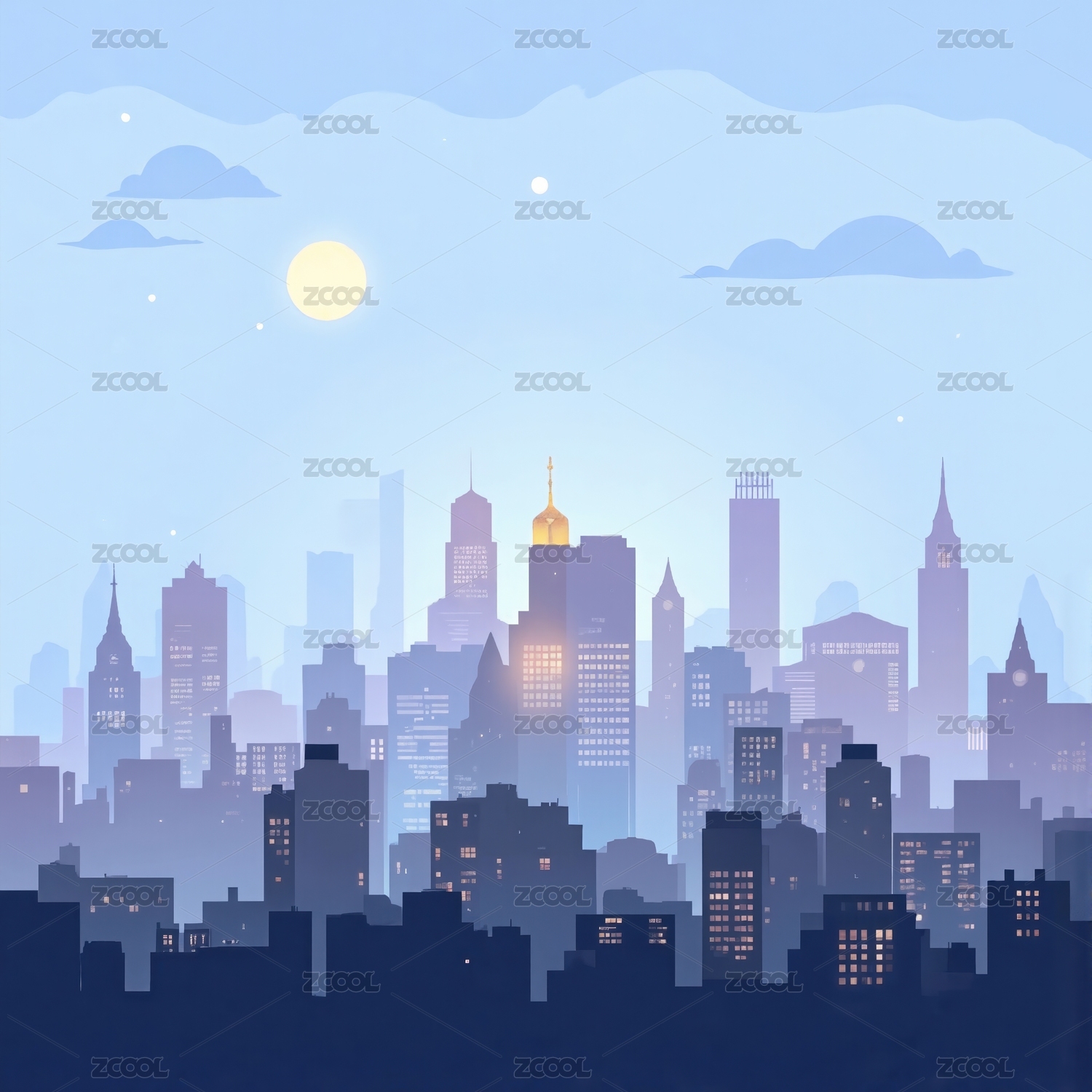 扁平风城市星空背景下的摩天大楼插画