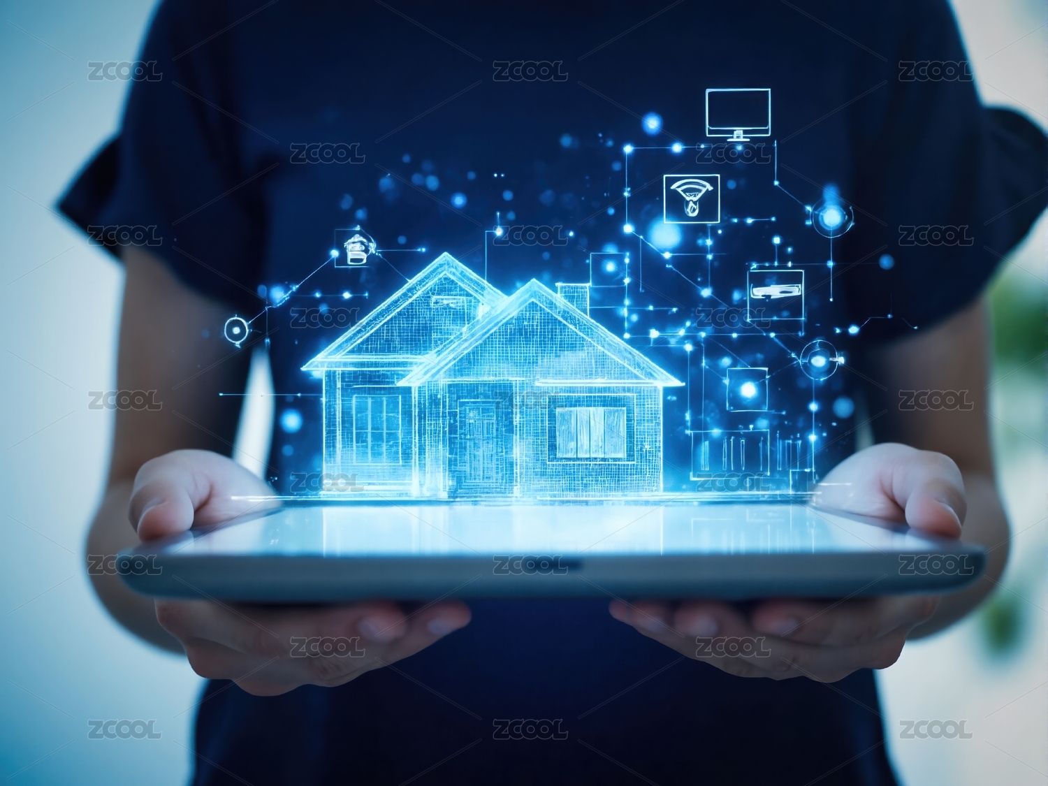 双手捧着平板电脑投射出智能化房屋全息影像