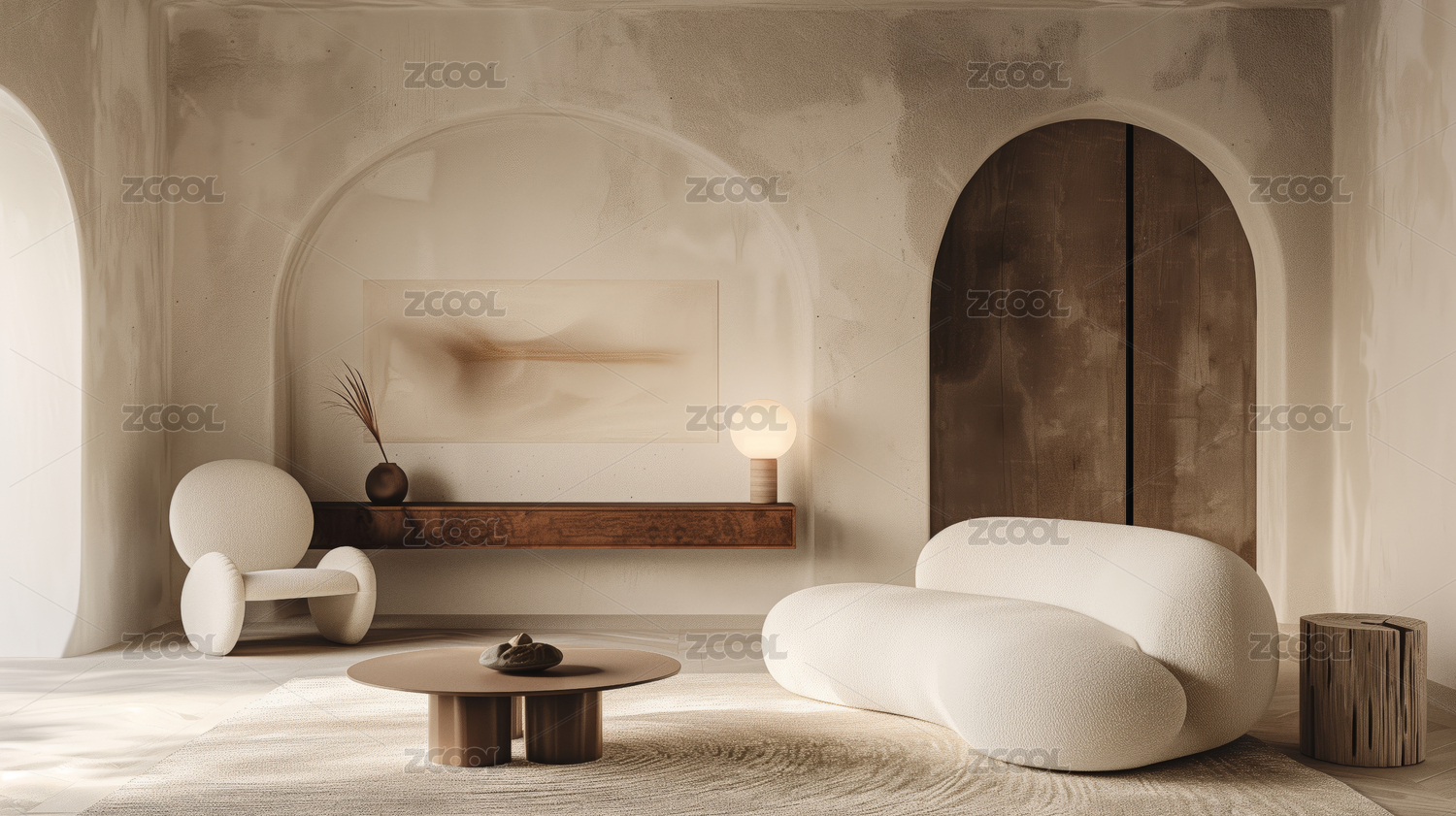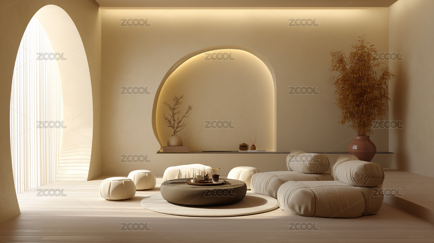室内设计,弧形窗户,柔和色调,现代简约,沙发组合,木质地板,装饰植物,圆形茶几,自然光线,墙面拱门