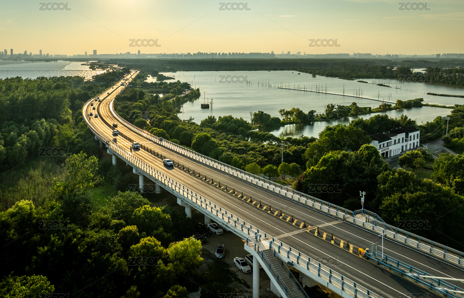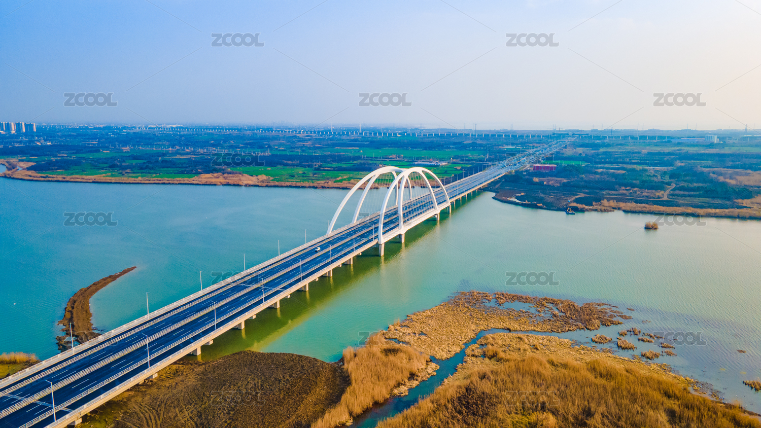 航拍江苏省常州金坛区钱资湖大桥与湿地公园