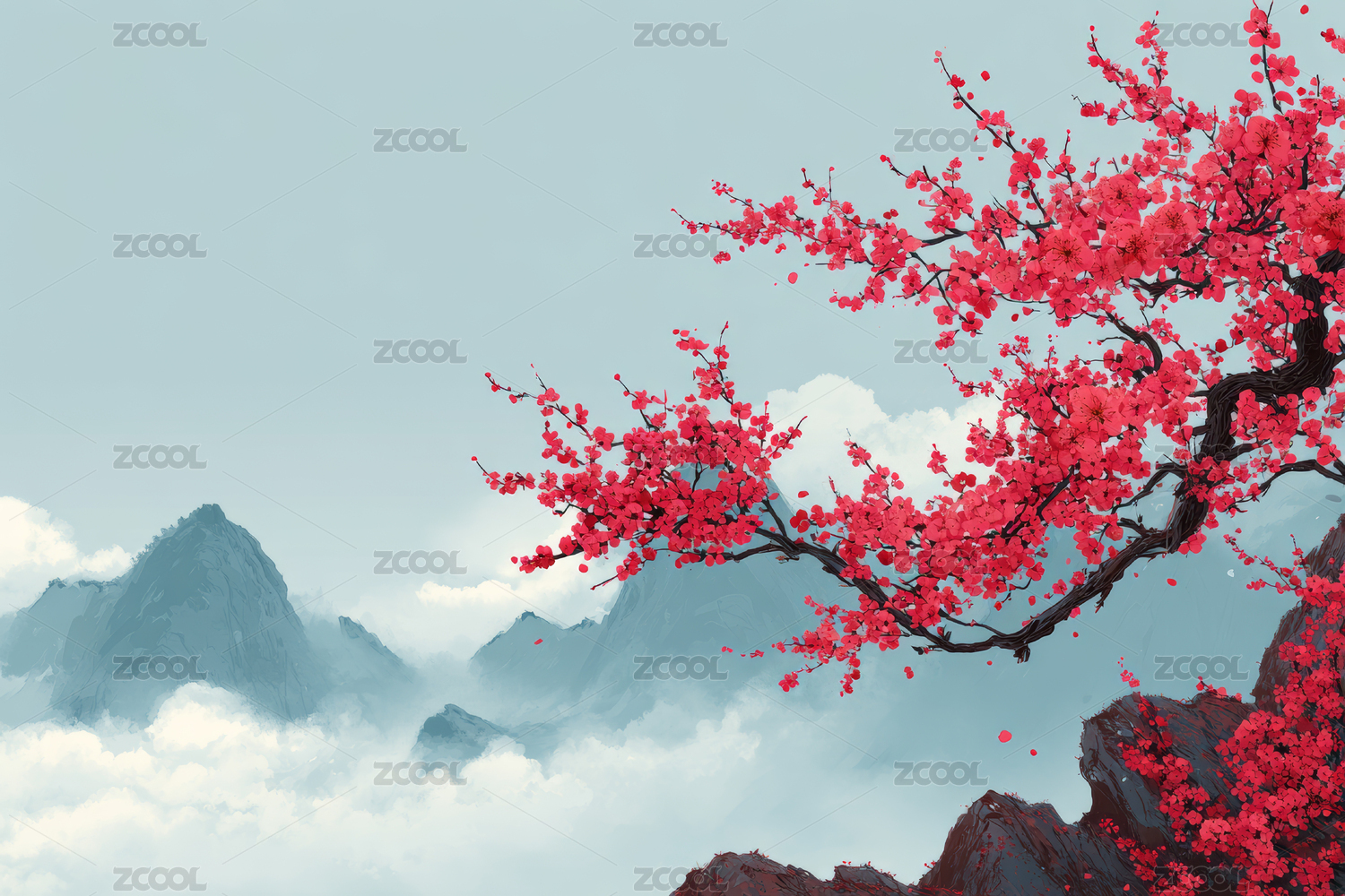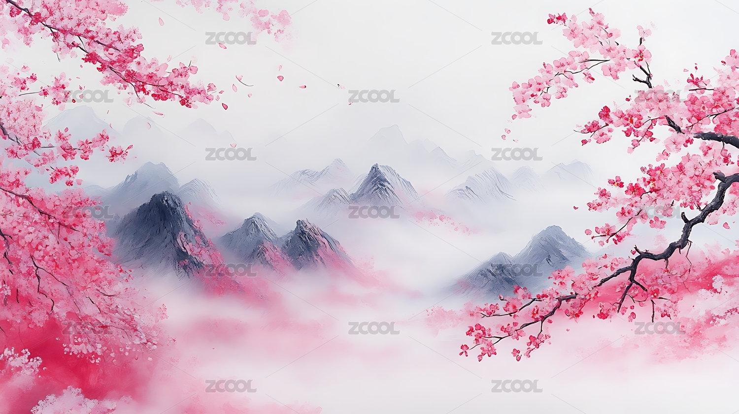 山水,樱花,雾气,山峰,春天,花瓣,枝头,朦胧,美景,自然