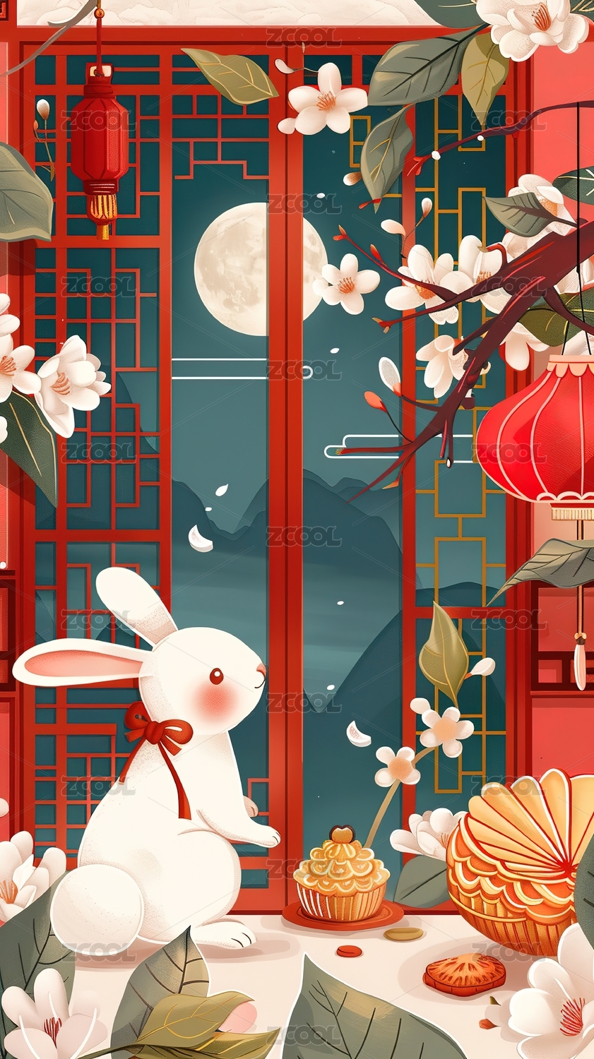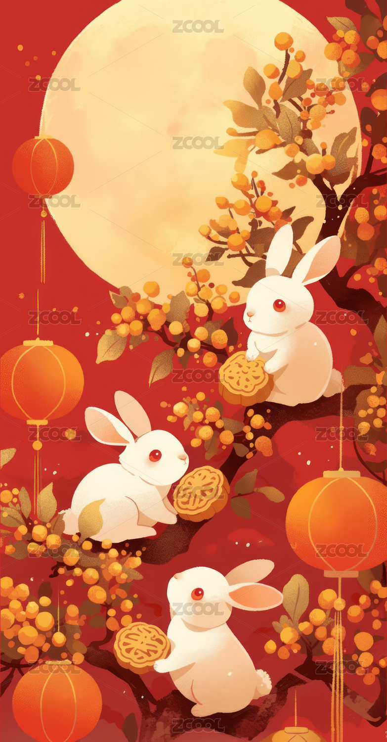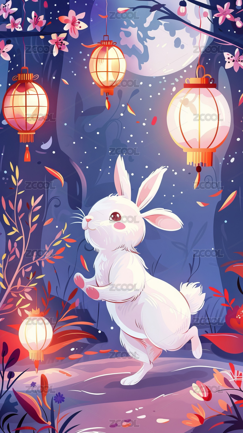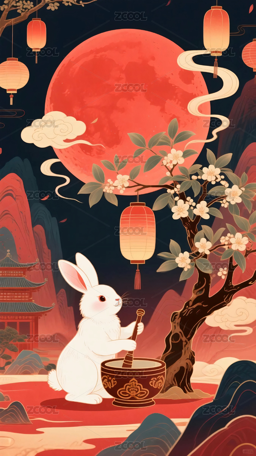 中秋节海报插画兔子玉兔在桂花树下捣药