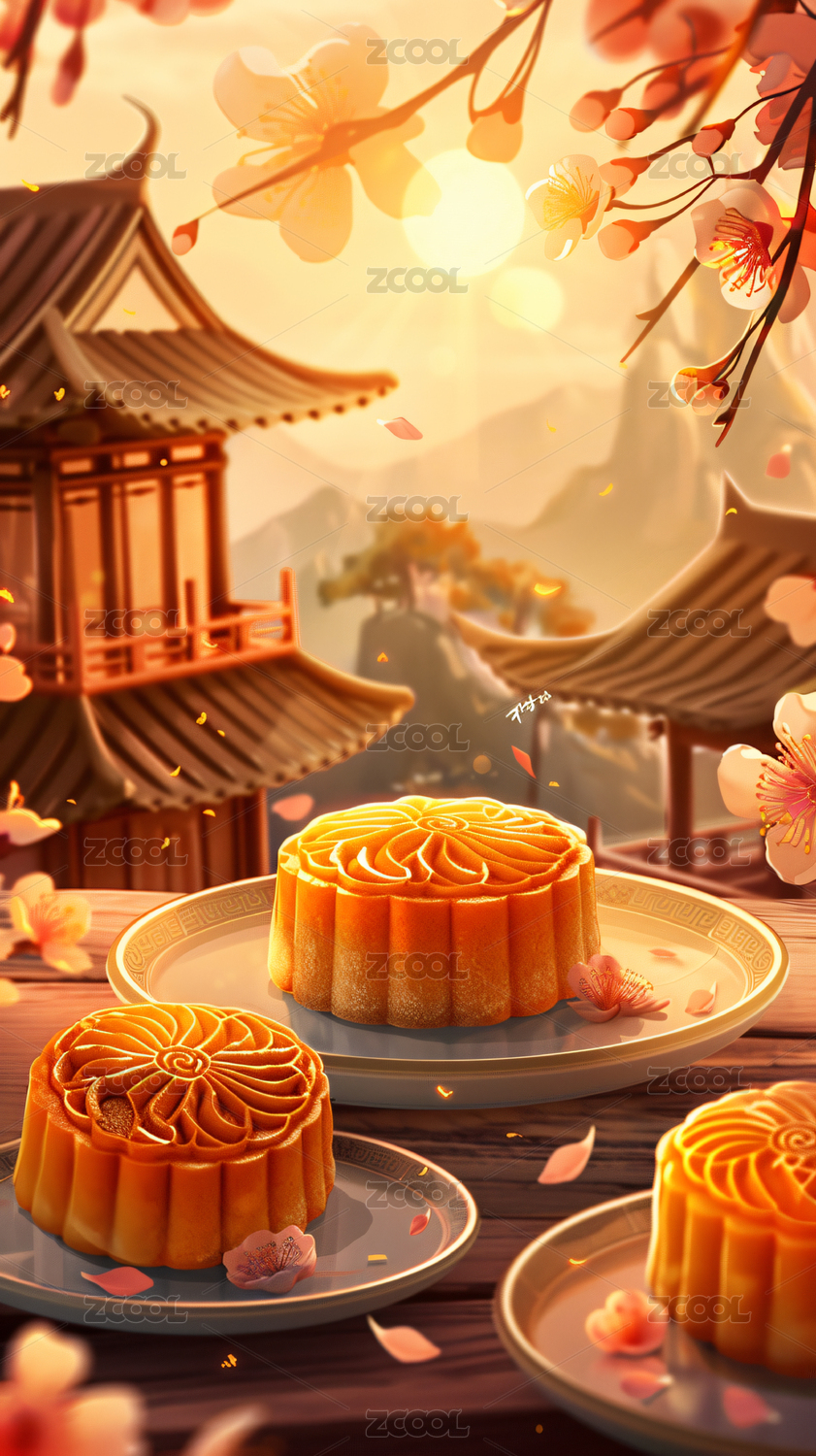 中秋节,月饼,满月,樱花,传统建筑,宝塔,风景,夜景,中国建筑,灯笼