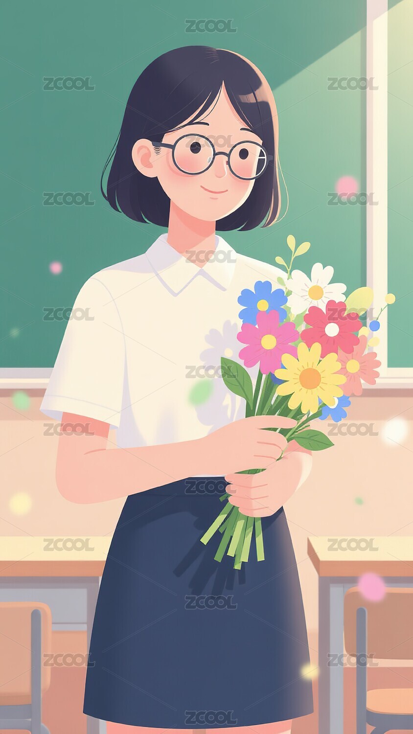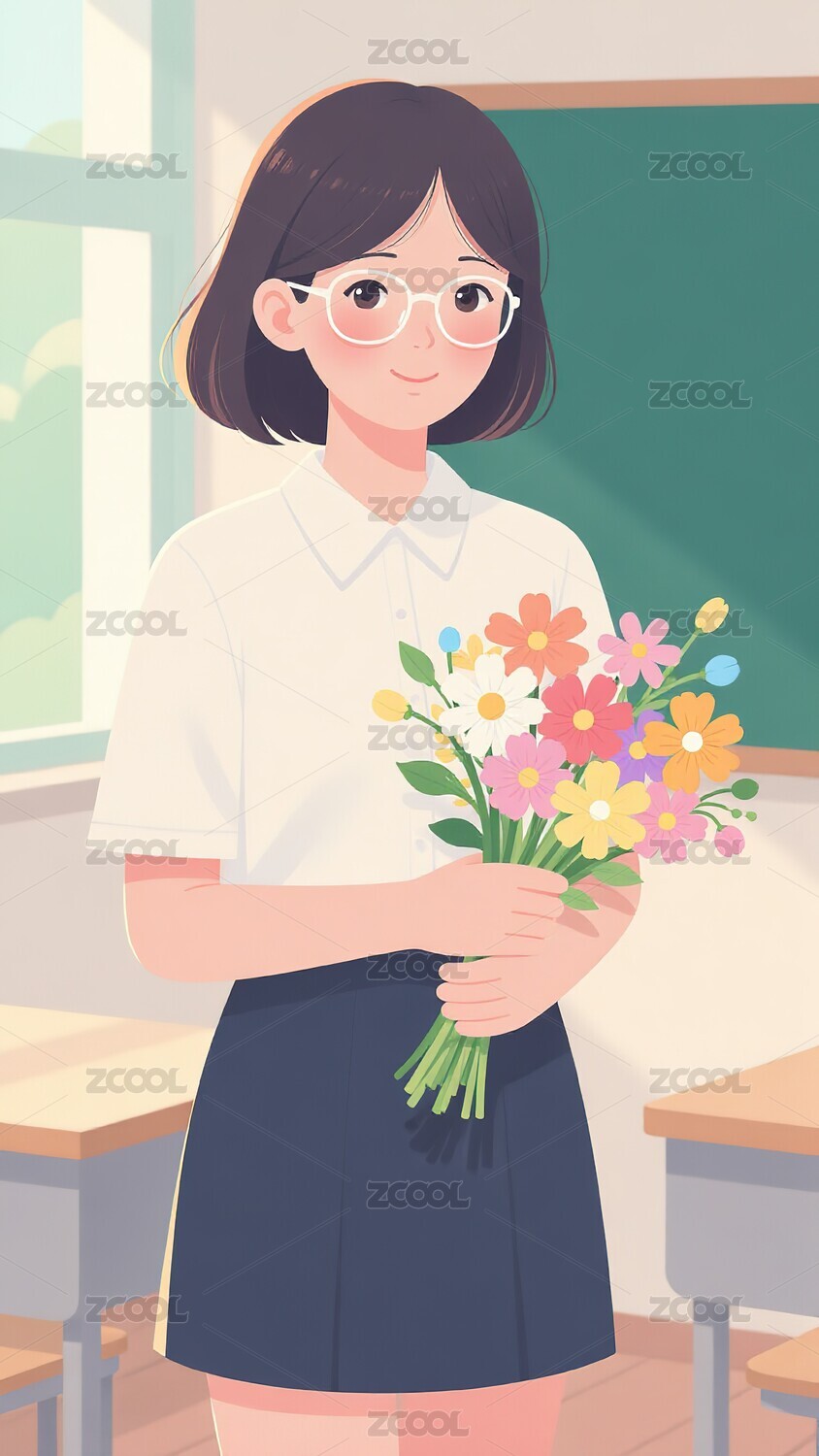 教室里手持鲜花的年轻女教师
