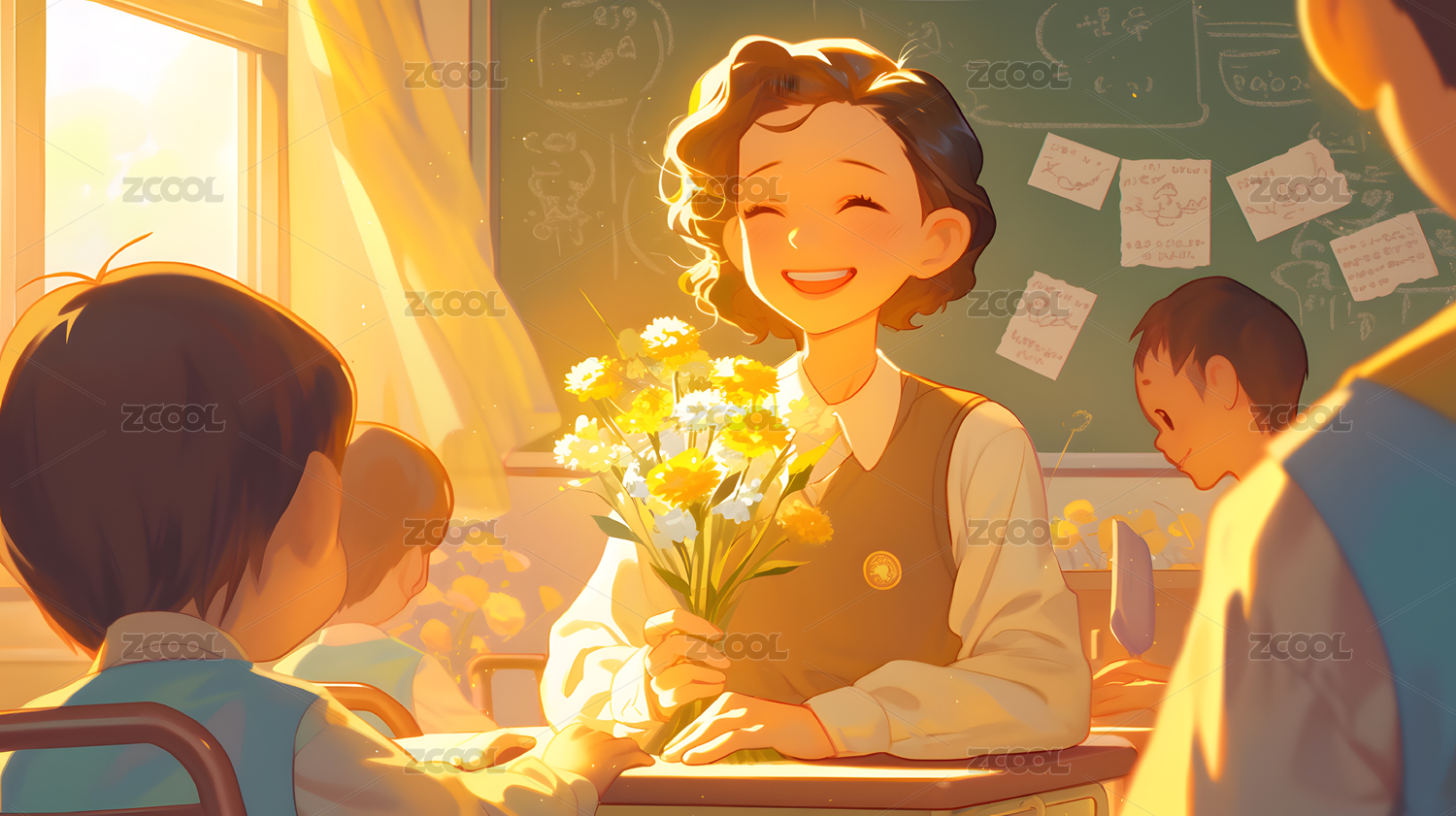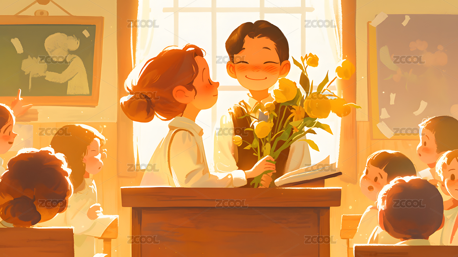 小女孩,女老师,献花,教室,学校,教育,学生,教师,课堂,小学生