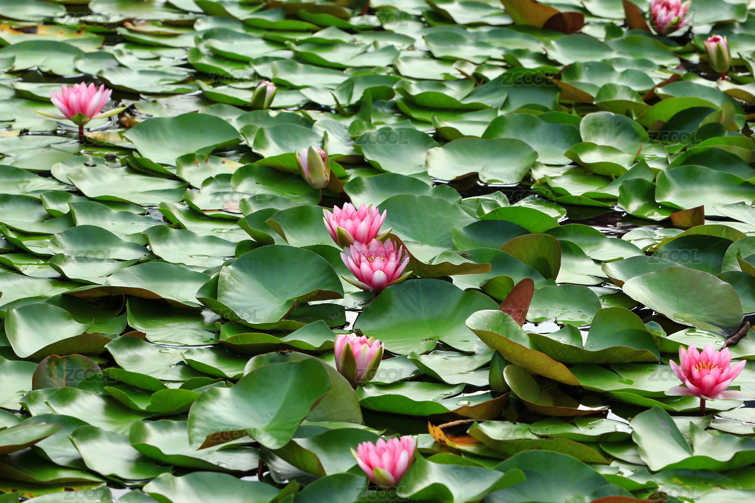 夏天池塘里绿色叶子上面盛开的睡莲花