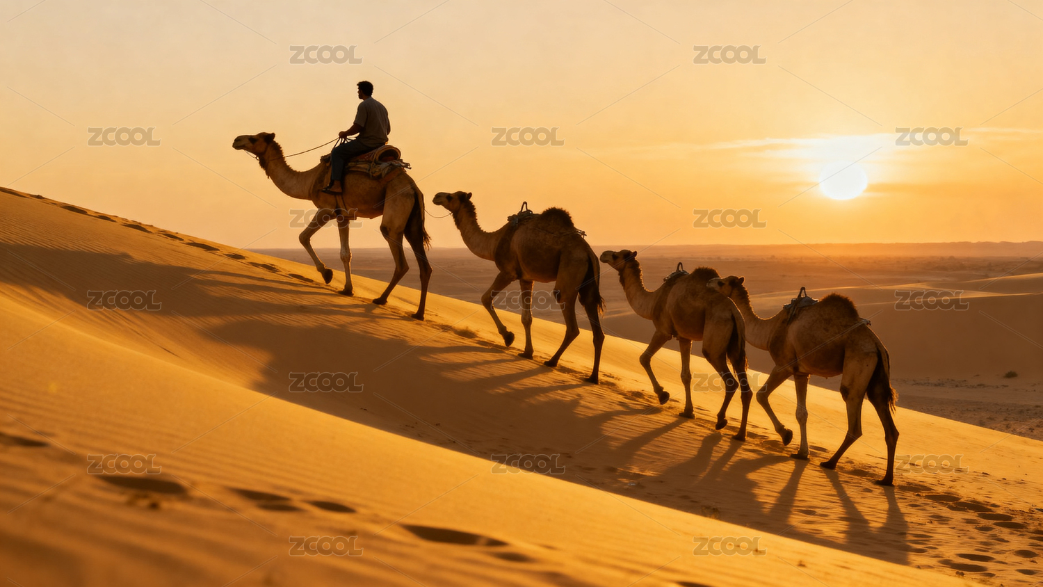 沙漠剪影孤单的人赶着骆驼日落时分的天空下
