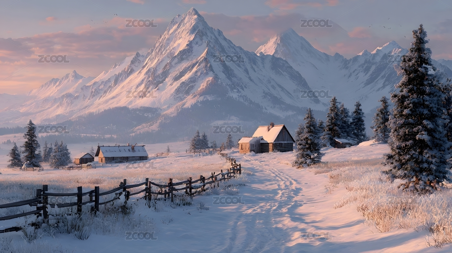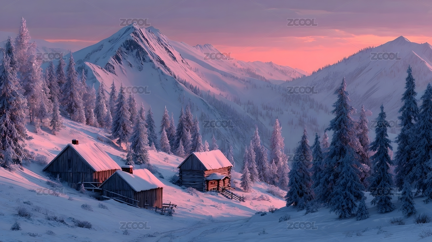 冬日雪山与木屋风景