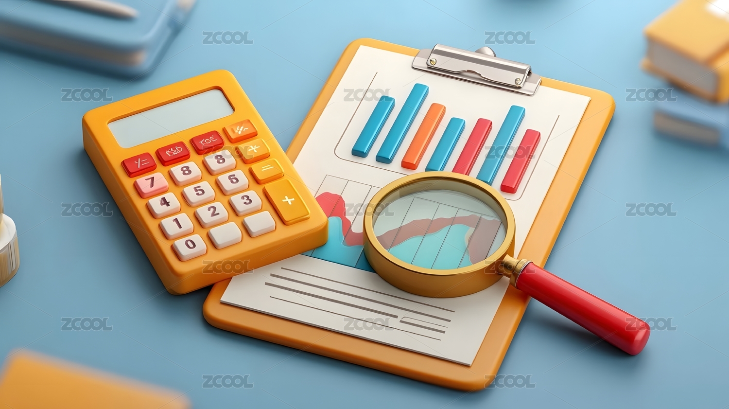 金融经济数据增长概念——放在财务数据报表上的放大镜和算盘