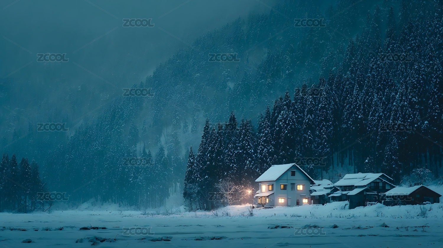 雪夜山间小屋温暖灯光