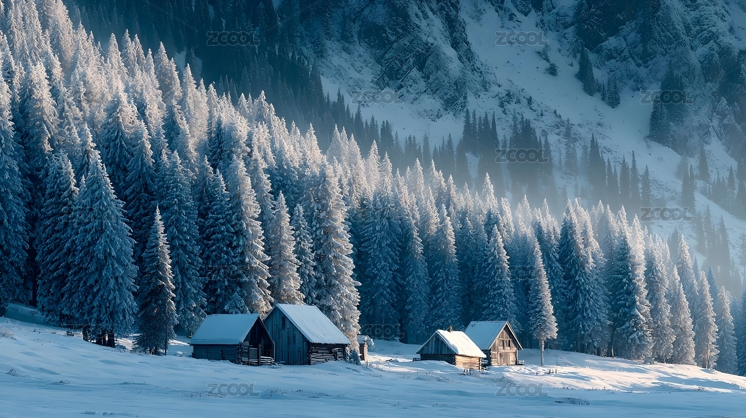 雪覆山间小屋冬日宁静风光
