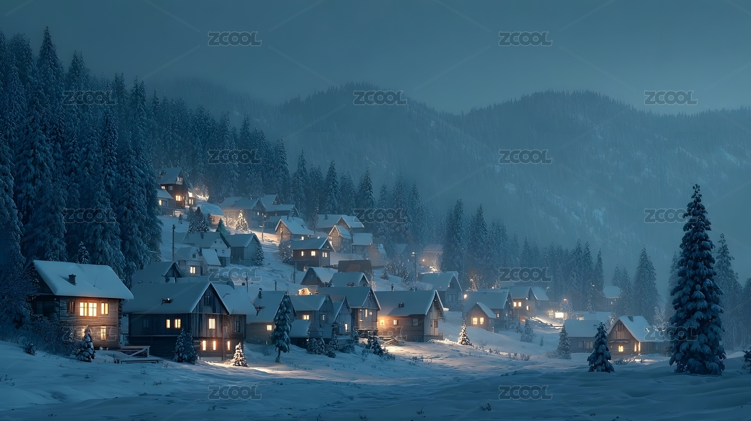 雪夜山村灯火温馨