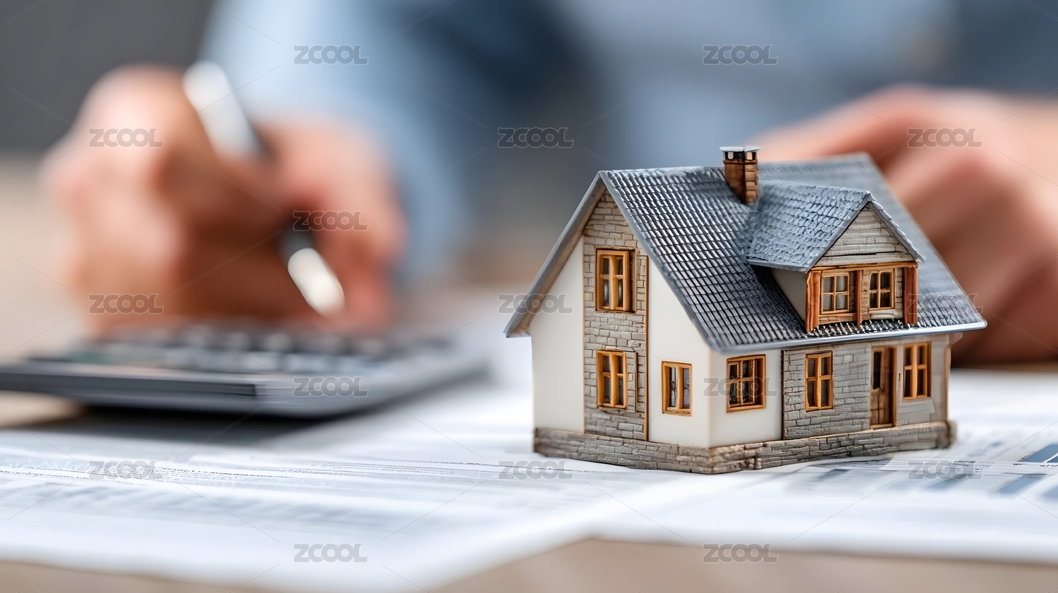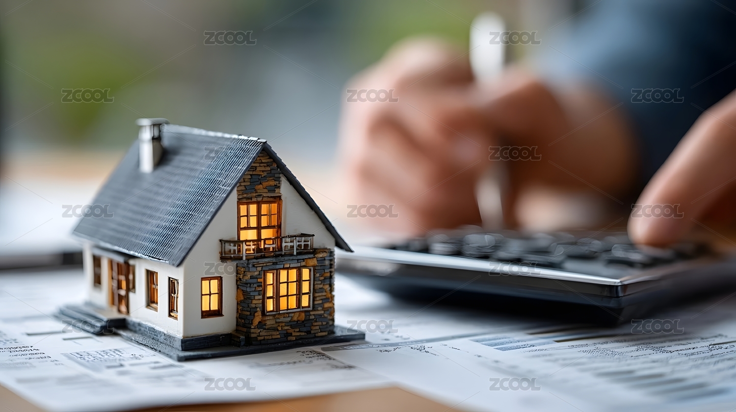 房产投资者正坐在桌子前使用计算器计算桌上同时还放置着小房子模型和美元硬币