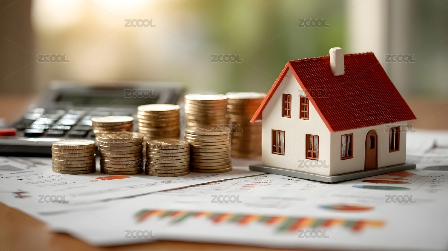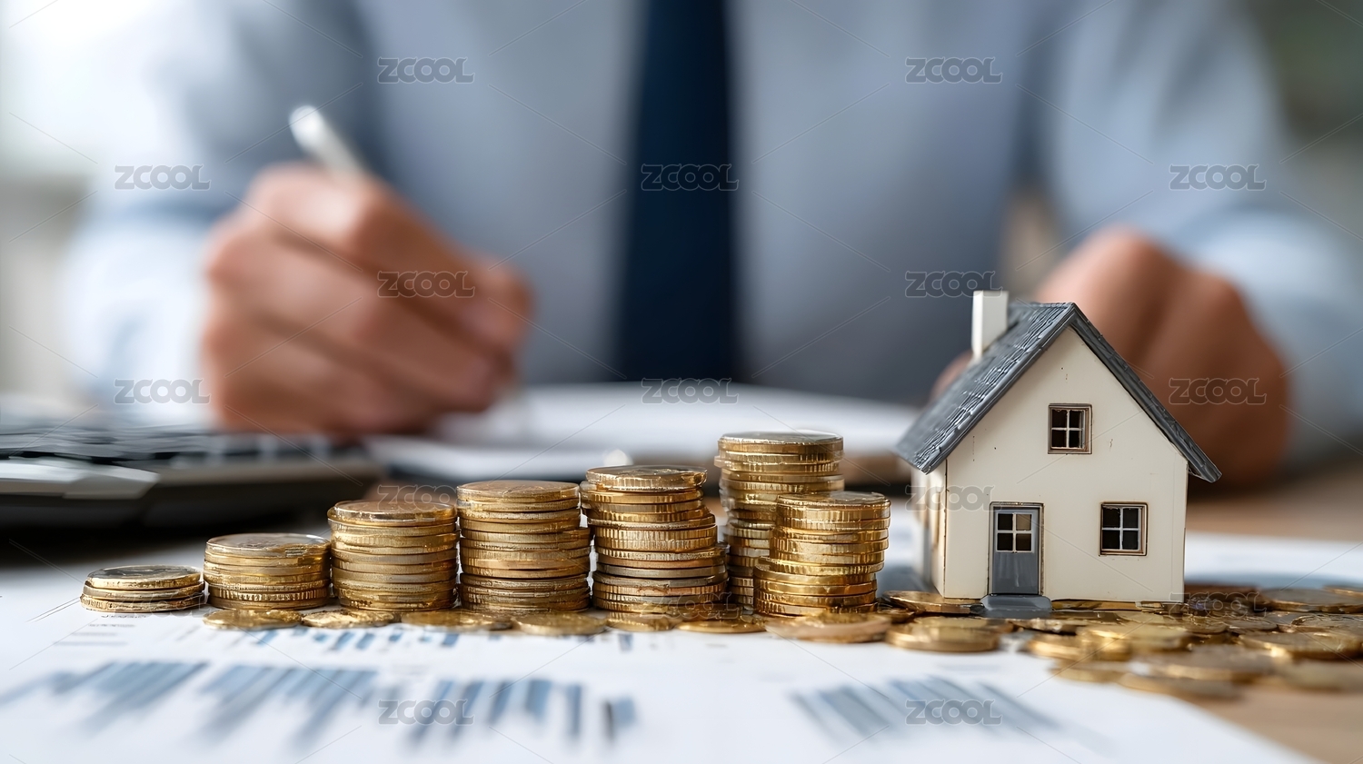 穿正装打领带的商务男性摆放着金融资料上的美元硬币桌上同时还有小房子模型和计算器