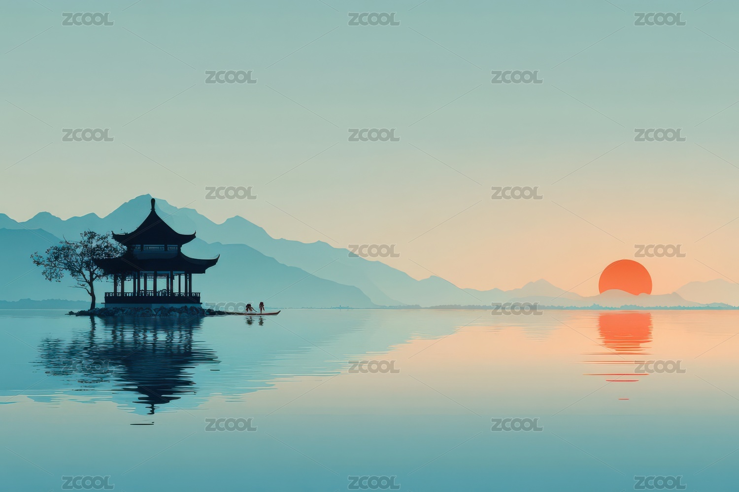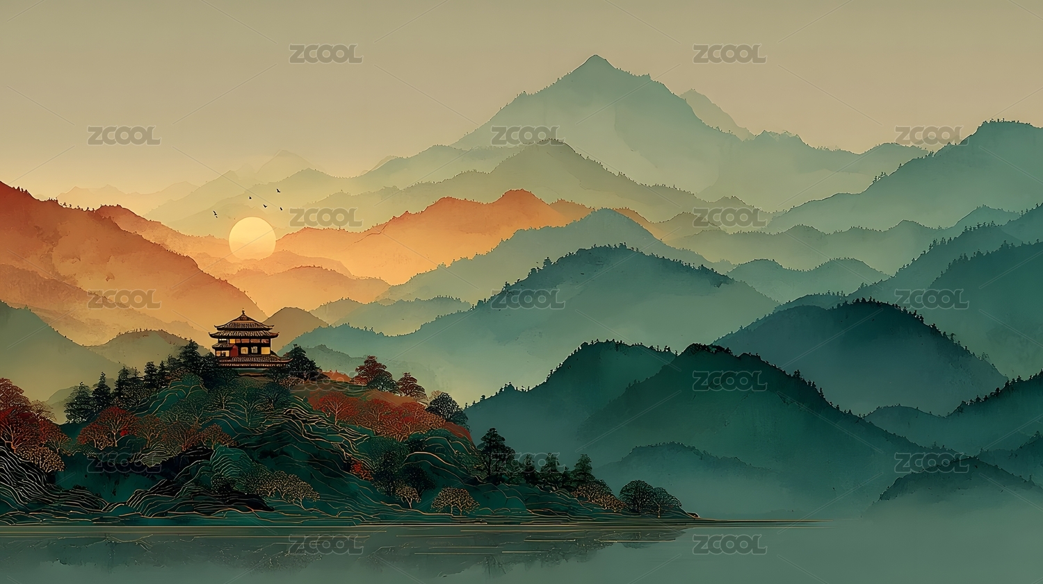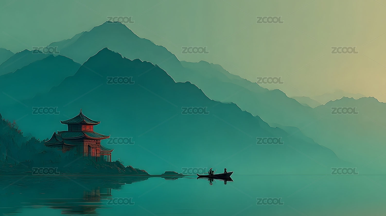 烟雨朦胧山水间古建筑与渔舟相映成趣