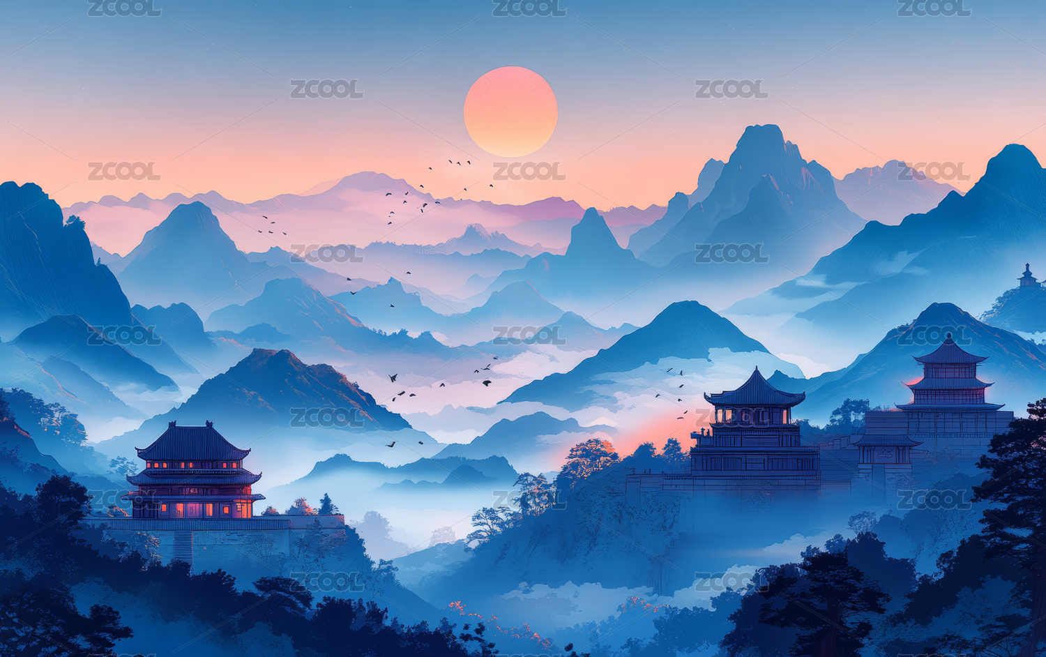 远山,风景,山峦,云雾,山峰,金色,水墨,山谷,高山,山景