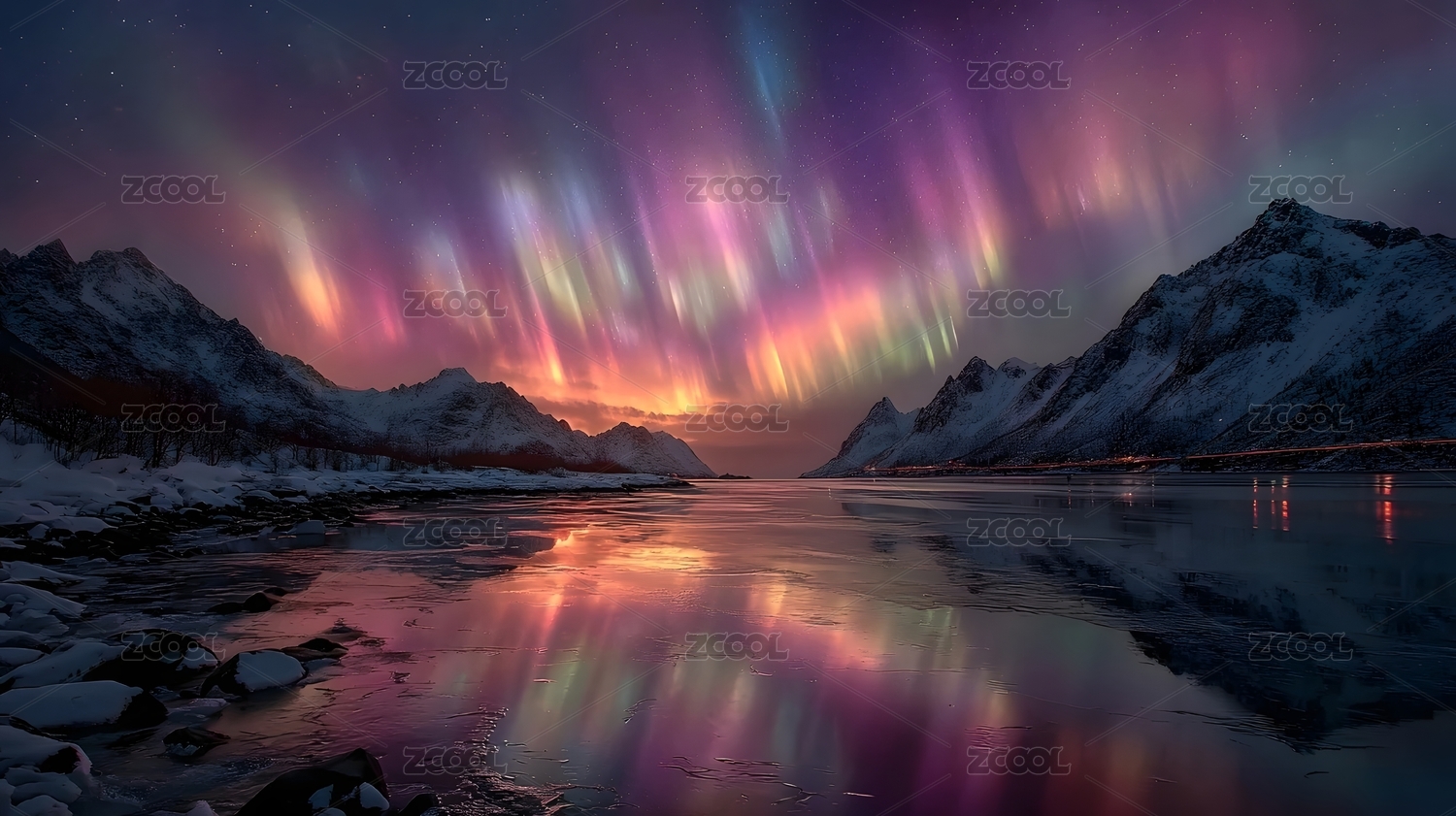 极光映雪山海滩夜景