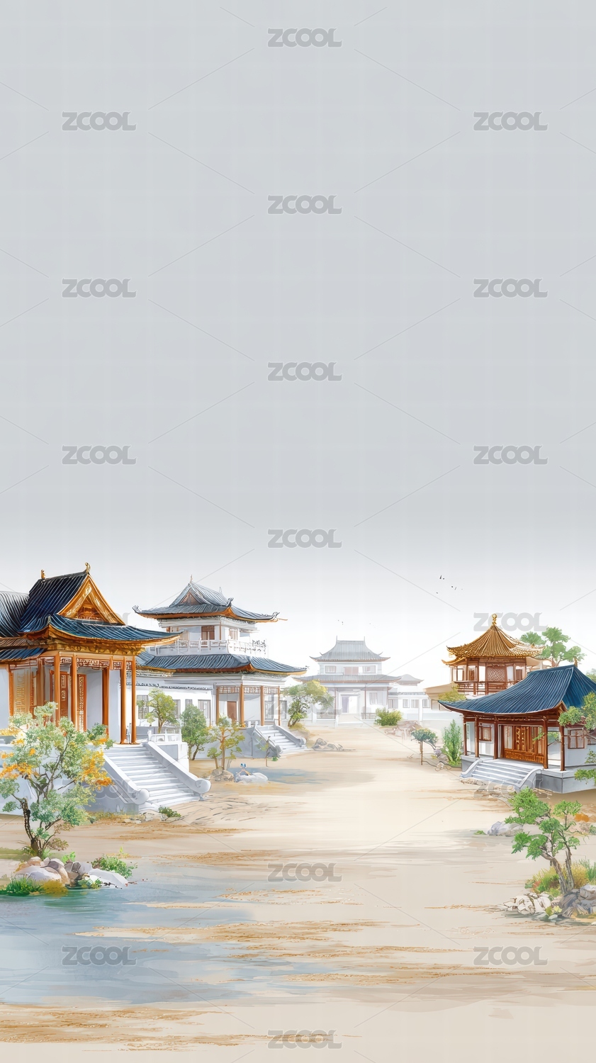 古建,亭台,飞檐,石径,庭院,绿树,山水,碧瓦
