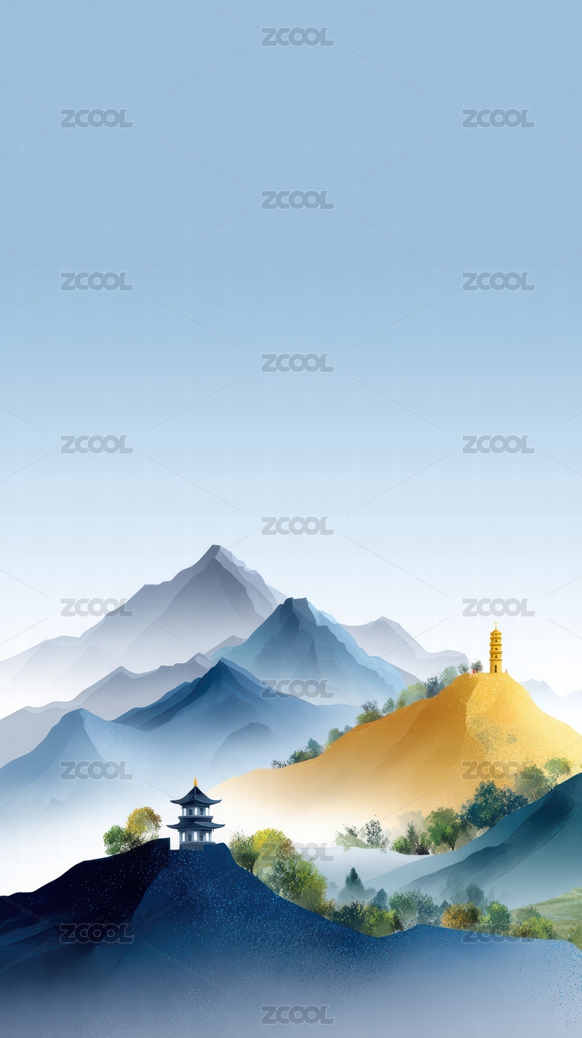抽象国风山峦中的亭子