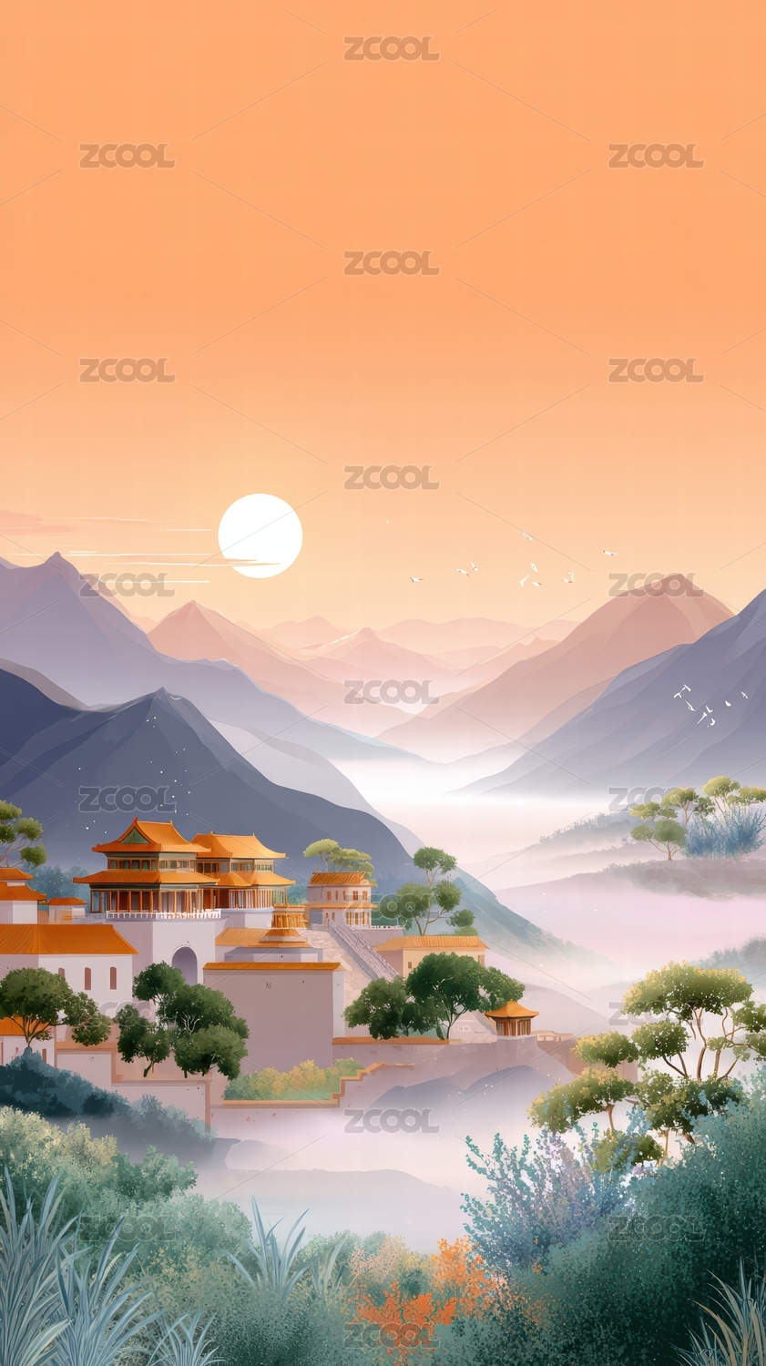 中国风诗意云雾江山唯美风景山水节气插画