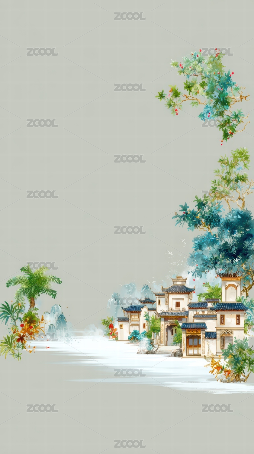 光影,绿树,建筑,古塔,庭院,亭台,飞檐,水池,花草