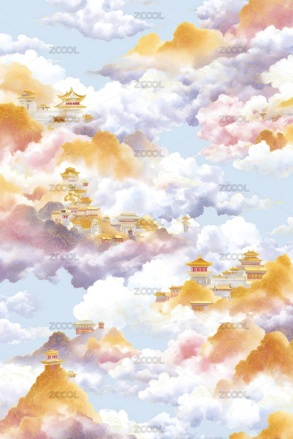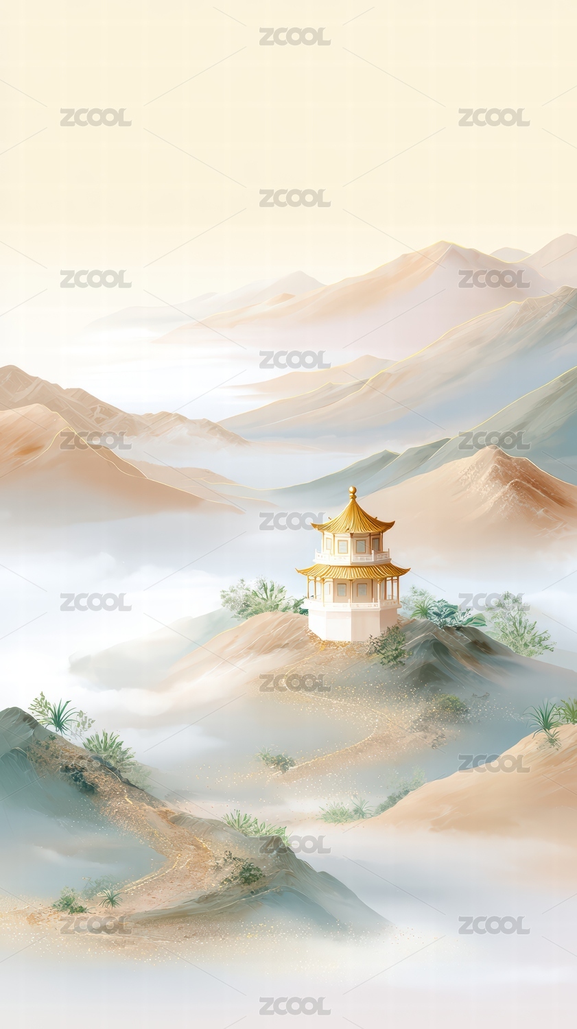 光影,山峦,仙境,建筑,云海,古塔,飞鸟,天际