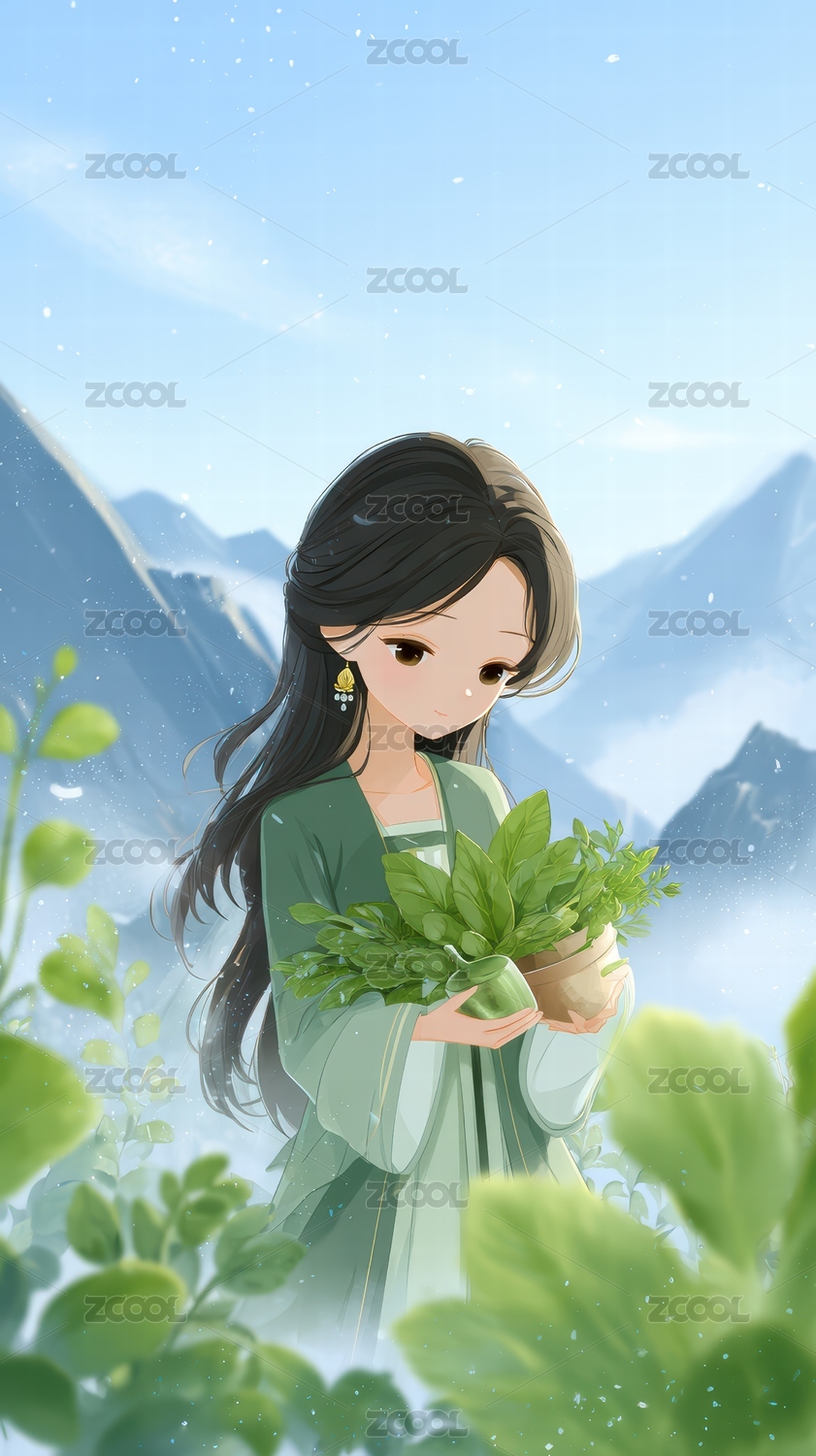 绿叶,少女,采茶,云端,篮子,山峦,薄雾,长发
