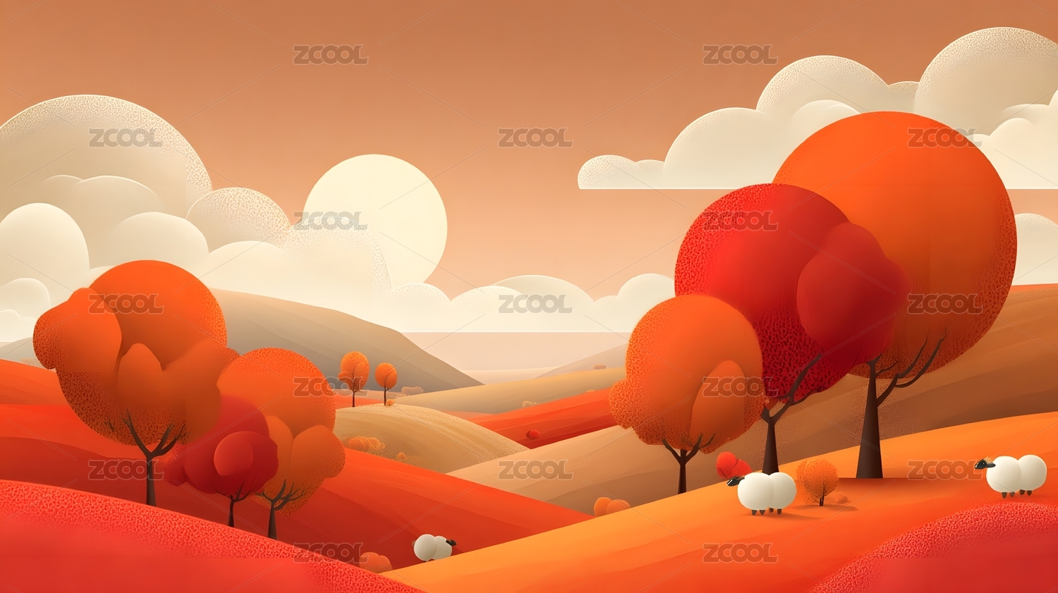 秋日山丘与橙红树