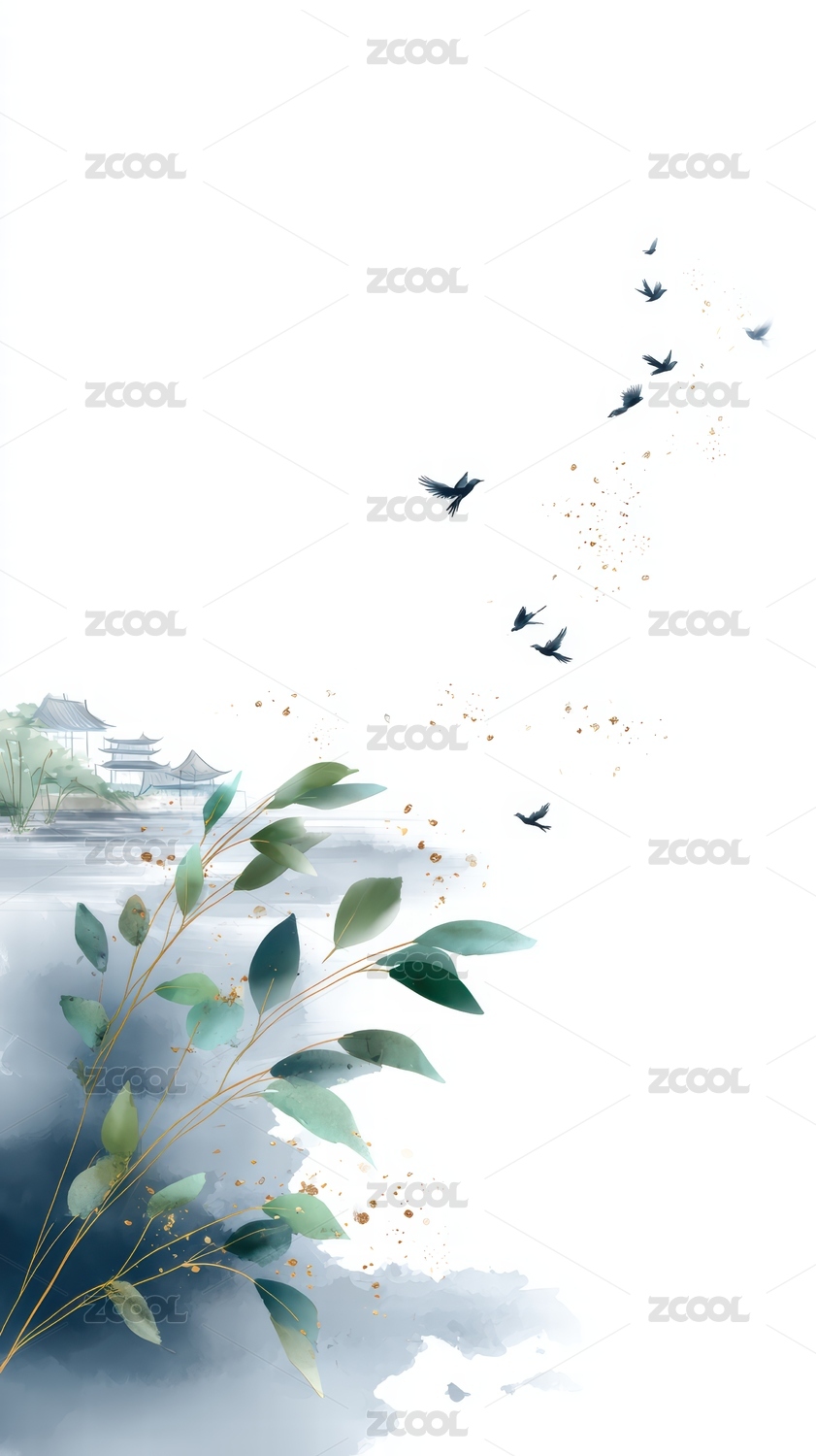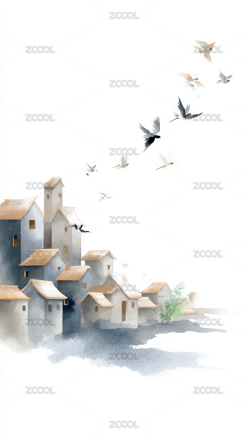 建筑,飞鸟,田园,绿树,屋顶,水乡,河流,宁静