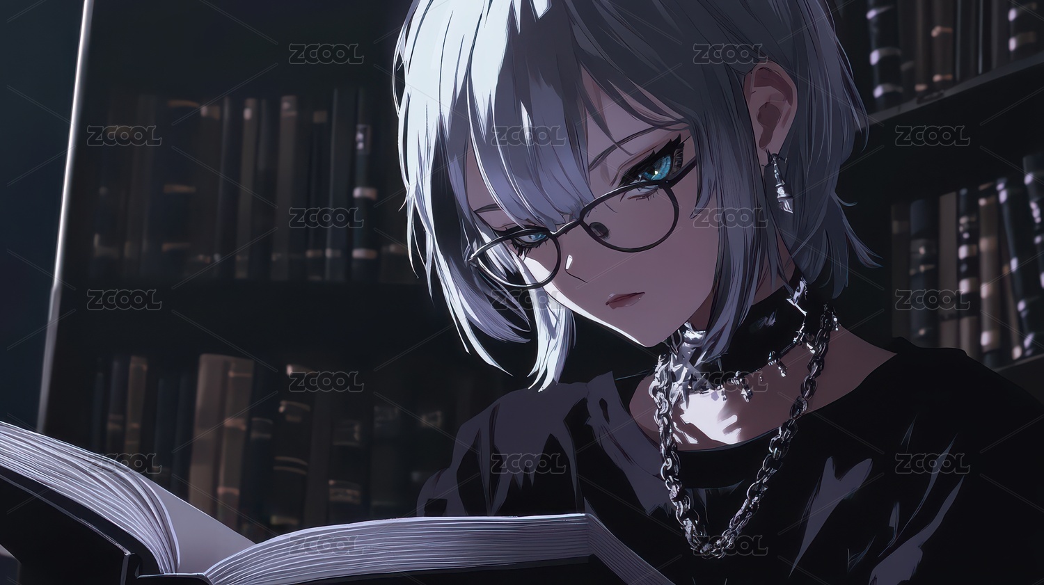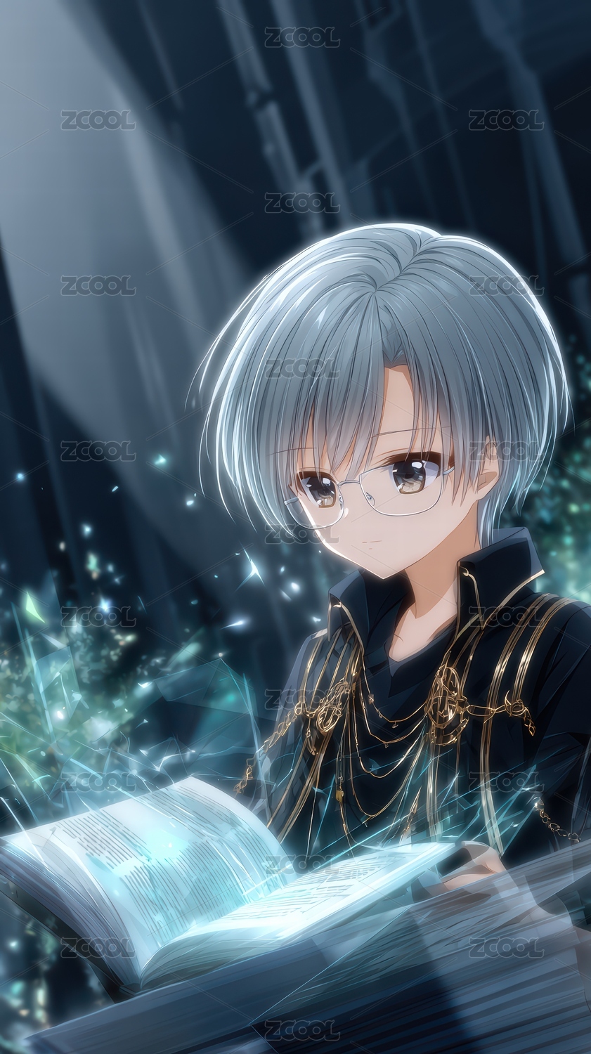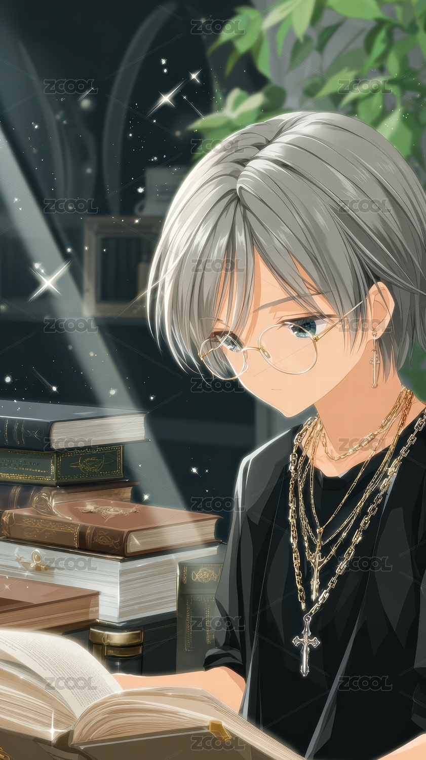 室内,梦幻,星光,少年,银发,眼镜,黑衣,项链,书籍,书桌